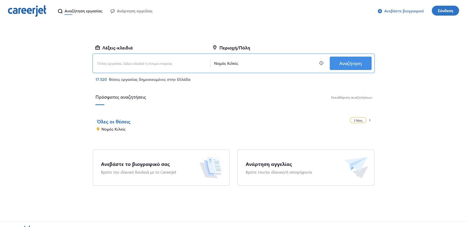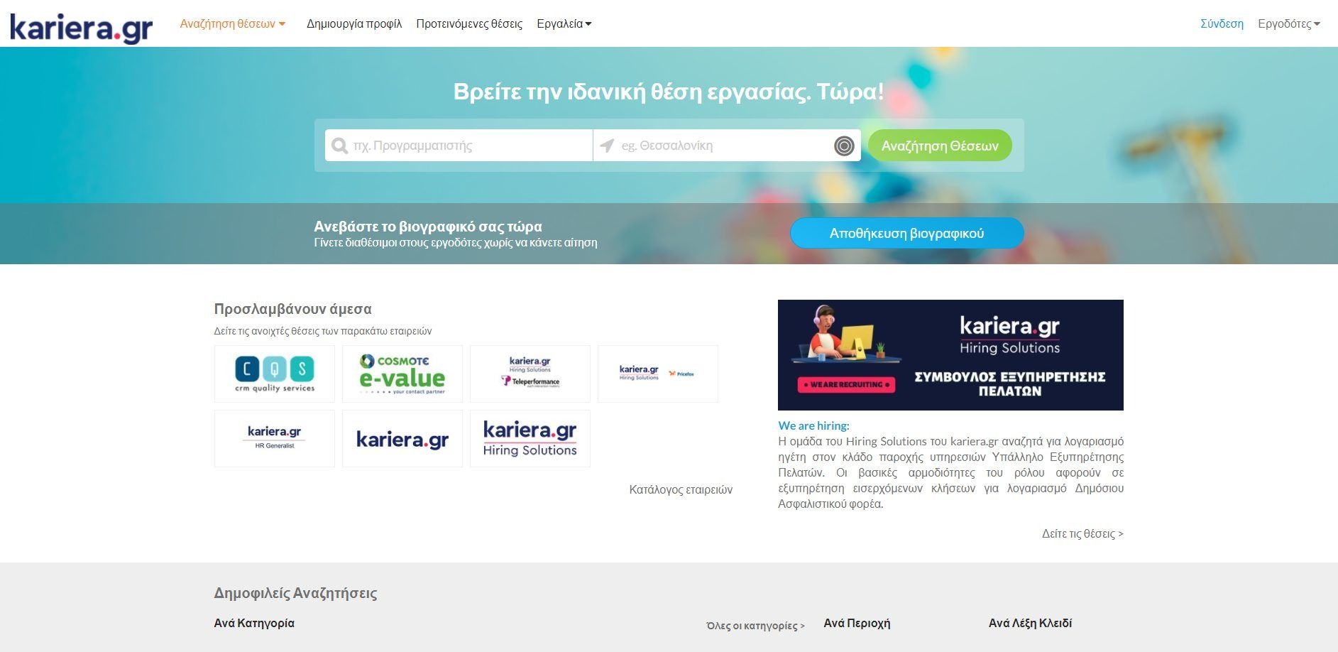 Έχοντας το «We are our people» ως κύριο moto και με περισσότερα από 20+ χρόνια εμπειρίας στον χώρο, το Kariera είναι μια από τις ιδανικότερες ιστοσελίδες για αναζήτηση εργασίας στην Ελλάδα και το εξωτερικό. Όπως και άλλες ιστοσελίδες της λίστας, έτσι και το Kariera σου δίνει την δυνατότητα να δημιουργήσεις έναν λογαριασμό, να εισάγεις το βιογραφικό σου και να το στέλνεις σε όσες ανοιχτές θέσεις εργασίας επιθυμείς. Η ιστοσελίδα σου επιτρέπει να αναζητάς επίσης με μεγάλη ευκολία, παρέχοντας επιπλέον πλήρης κατηγοριοποίηση για αναζήτηση εργασίας ανά περιοχή, κατηγορία, λέξει κλειδί και εταιρεία.
