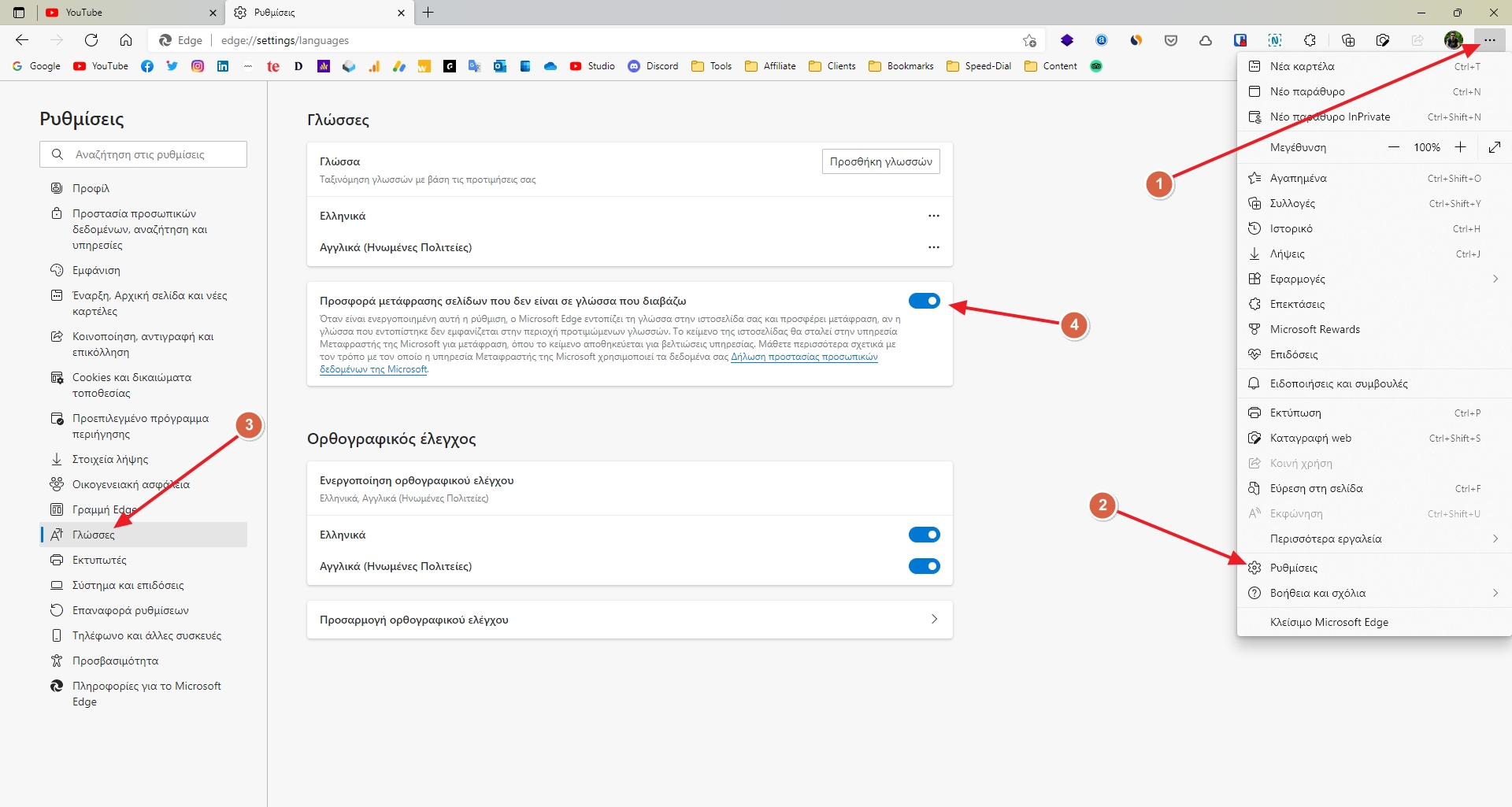 Από τις τρεις τελίτσες τέρμα επάνω δεξιά, κάνε κλικ στην επιλογή Ρυθμίσεις. Στη συνέχεια, από το αριστερό πλαϊνό μενού πήγαινε στην καρτέλα Γλώσσες.