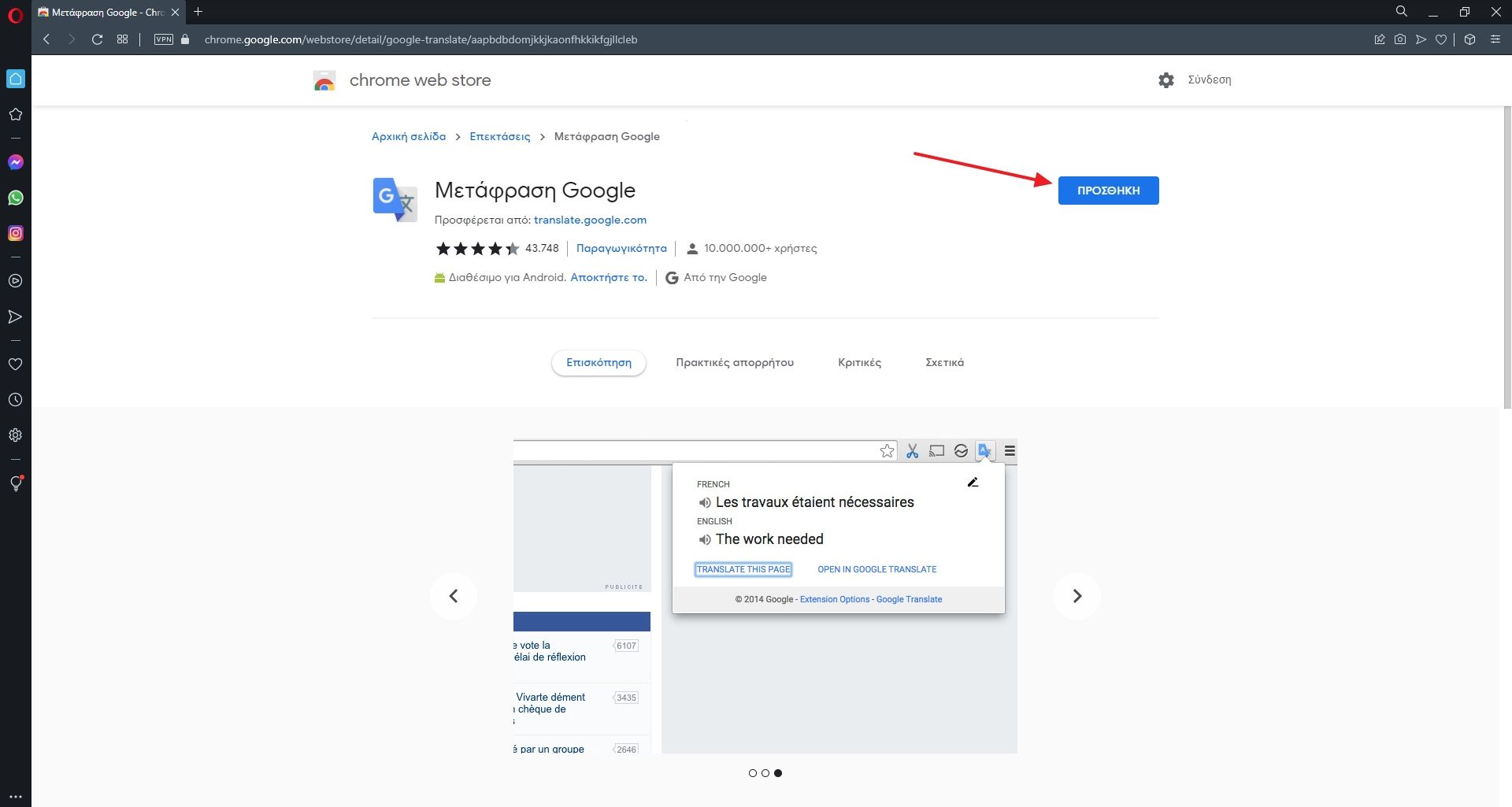 Άλλως ένας πασίγνωστος περιηγητής είναι και ο Opera. Αν και το συγκεκριμένο πρόγραμμα περιήγησης βασίζεται πλέον και αυτό εξ’ ολοκλήρου στο Chromium project, δεν παρέχει ενσωματωμένη αυτόματη μετάφραση από αγγλικά σε ελληνικά και σε αντίθεση με τον Firefox, δεν υπάρχει ούτε επίσημη επέκταση της Google. Ως εκ τούτου, θα χρειαστεί να εγκαταστήσεις την επίσημη επέκταση της Google απευθείας μέσα από το Chrome Web Store.