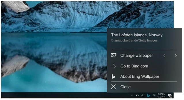 Με τη νέα αυτή η εφαρμογή, θα έχεις την δυνατότητα να αλλάζεις αυτόματα τα wallpapers στην επιφάνεια εργασίας του υπολογιστή σου με το πάτημα ενός κουμπιού. Με το που εγκαταστήσεις την εφαρμογή, θα εμφανιστεί τέρμα κάτω δεξιά ένα νέο εικονίδιο της Bing, το οποίο θα μπορείς να πατάς για να αλλάζεις το wallpaper που έχεις με όσα έχει ανεβάσει η μηχανή αναζήτησης στην ιστοσελίδα της. Θα έχεις επίσης την δυνατότητα να αποκτάς γρήγορη πρόσβαση στο Bing.com κάνοντας κλικ στην επιλογή “Go to Bing.com”.