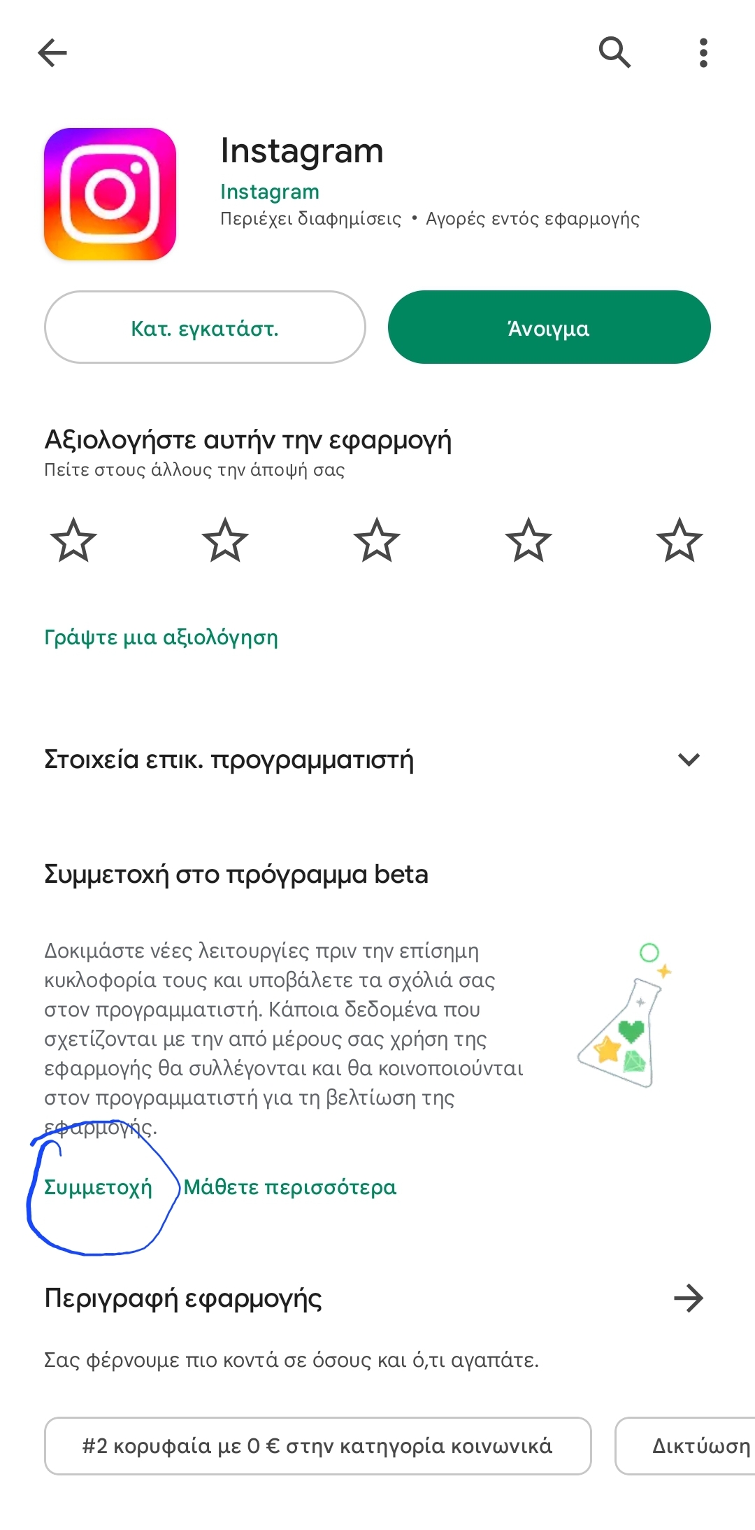 Καλησπέρα Γιώργο, άνοιξε το Play Store, αναζήτησε το Instagram και κάνε κλικ να μπεις στις πληροφορίες του (στη σελίδα που δείχνει τις φωτογραφίες, το κουμπί της εγκατάστασης/απεγκατάστασης κλπ). Στη συνέχεια, κατέβα λίγο πιο κάτω και μόλις εντοπίσεις την επιλογή “Συμμετοχή στο πρόγραμμα beta” κάνε κλικ στην επιλογή “Συμμετοχή”.