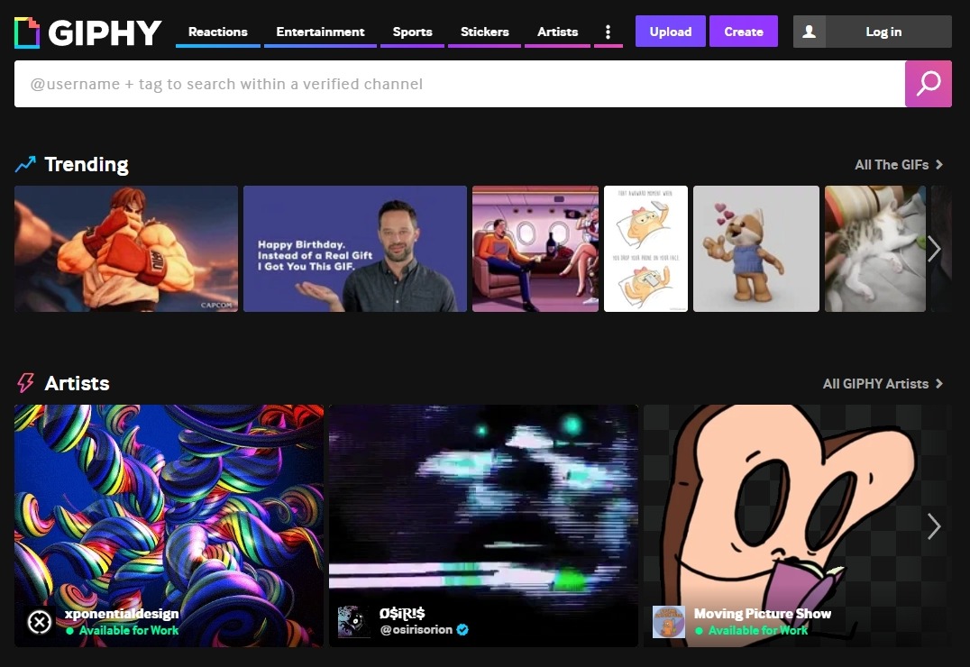 Τέλος, η υπηρεσία σου επιτρέπει να ανεβάζεις απεριόριστο αριθμό GIF εικόνων εντελώς δωρεάν, ενώ υποστηρίζει πλήρως (εκτός από τα .gif) και τις μορφές αρχείων .MP4 και .MOV. Παρέχεται επίσης και ένα εργαλείο για να δημιουργείς GIF εικόνες απευθείας μέσα από την ιστοσελίδα του GIPHY.