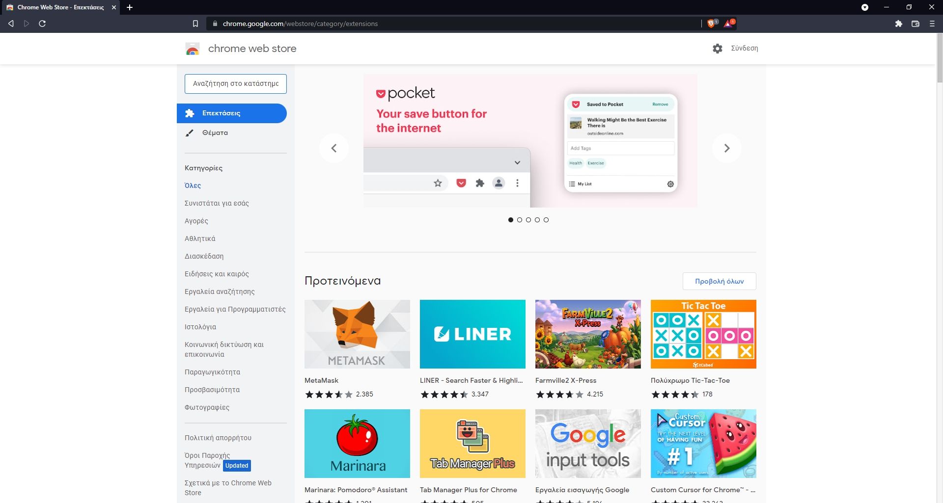 Το Chrome Web Store περιλαμβάνει μια τεράστια γκάμα διαθέσιμων επεκτάσεων τις οποίες μπορείς να βρεις οργανωμένες σε διαφορετικές ενότητες. Όποια επέκταση και αν θέλεις να εγκαταστήσεις, απλά κάνε κλικ για να μπεις μέσα στη σελίδα της. Από εκεί, θα βρεις και περισσότερες πληροφορίες, όπως την περιγραφή και τις αξιολογήσεις από άλλους χρήστες.