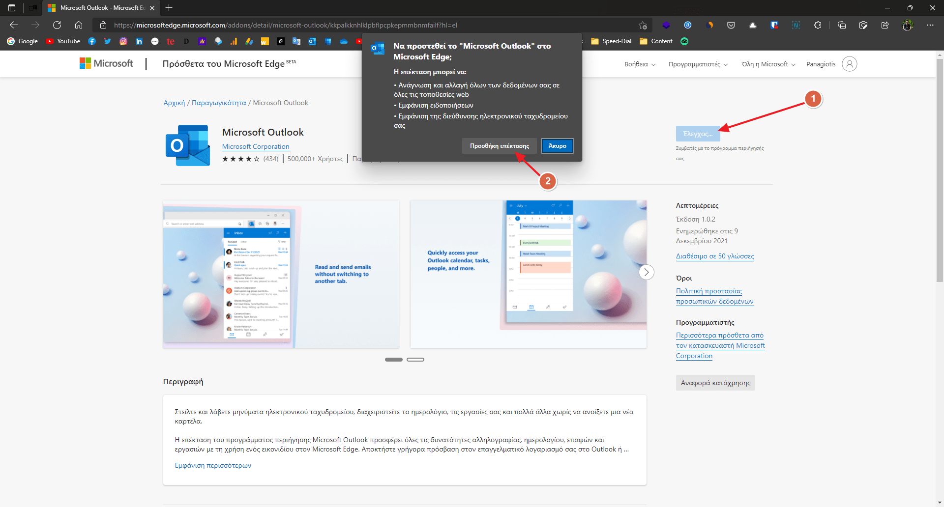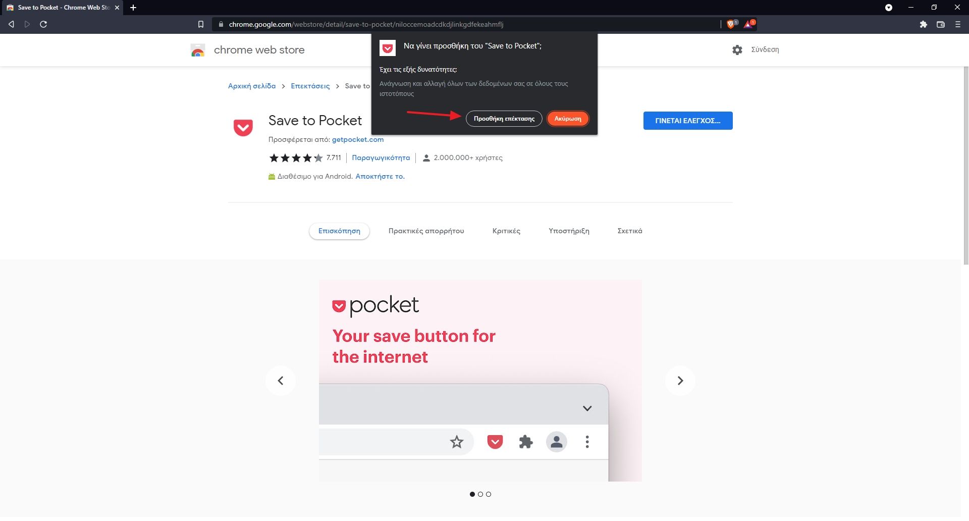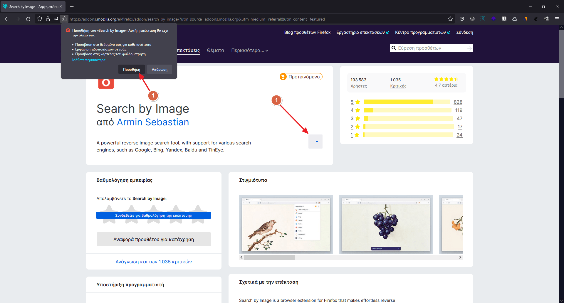 Κάνε κλικ για να μπεις στη σελίδα μιας επέκτασης και απλά κάνε κλικ στο κουμπί “Απόκτηση” και “Προσθήκη επέκτασης” στο αναδυόμενο παράθυρο που θα εμφανιστεί λίγα δευτερόλεπτα μετά.