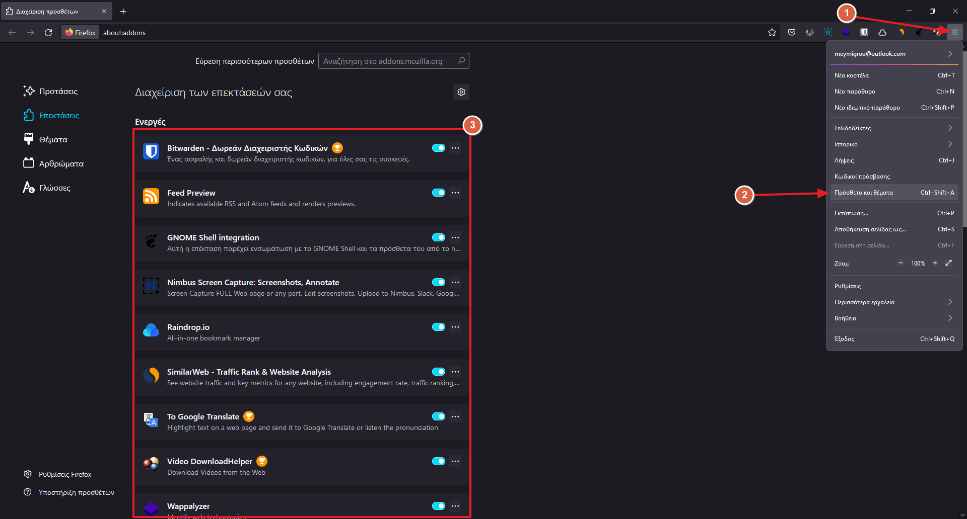 Για να διαχειριστείς τις επεκτάσεις που έχεις εγκατεστημένες κάνε κλικ στο μενού (τρεις παύλες) τέρμα επάνω δεξιά και πάνε στην επιλογή “Πρόσθετα και θέματα“. Από εδώ θα έχεις την δυνατότητα να ενεργοποιήσεις, να απενεργοποιήσεις και να διαγράψεις όποια επέκταση επιθυμείς.