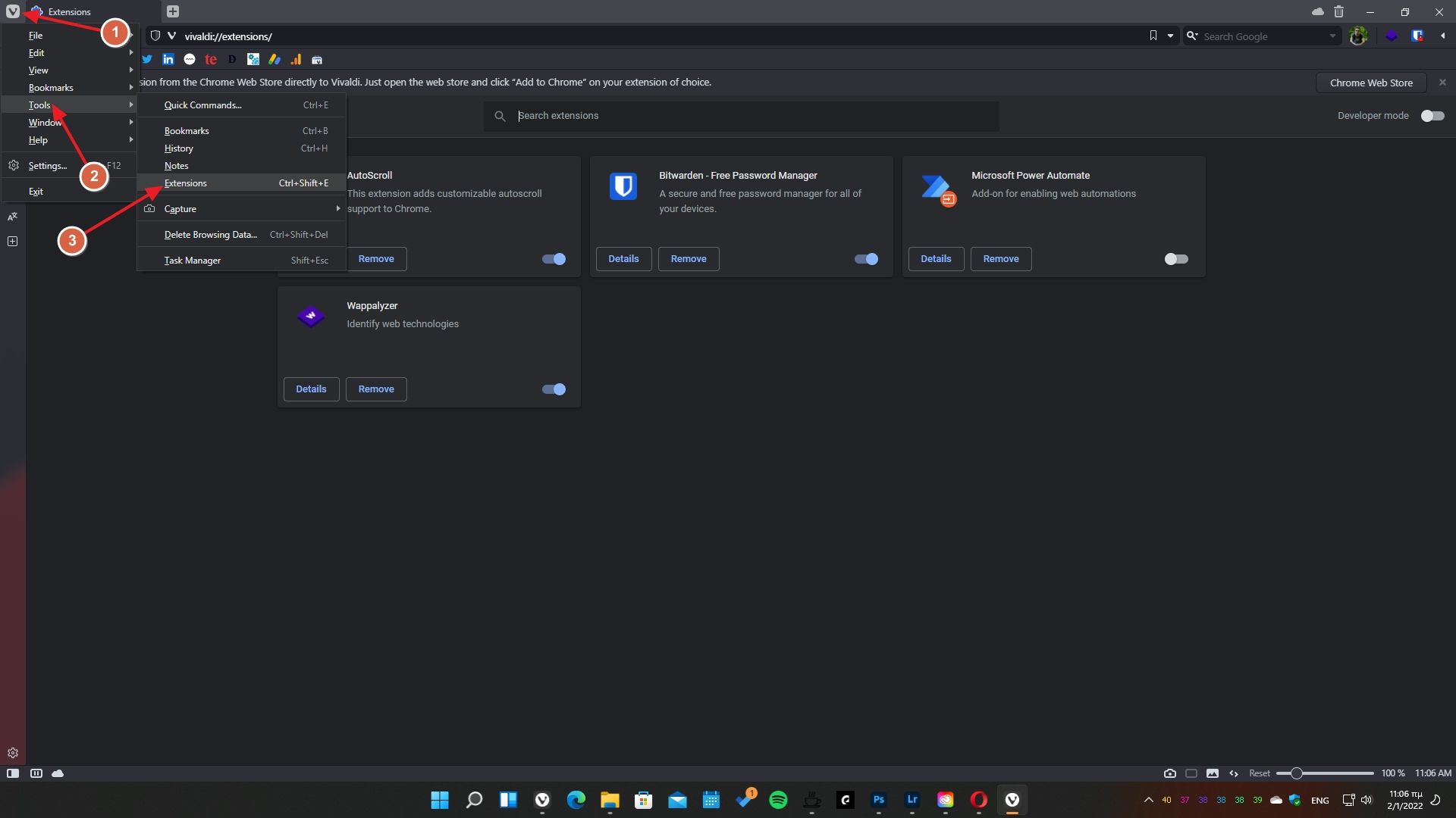 Για να διαχειριστείς όλες τις εγκατεστημένες επεκτάσεις, κάνε κλικ στο εικονίδιο του Vivaldi τέρμα επάνω αριστερά και στη συνέχεια από το μενού πήγαινε στα Εργαλεία -> Επεκτάσεις.