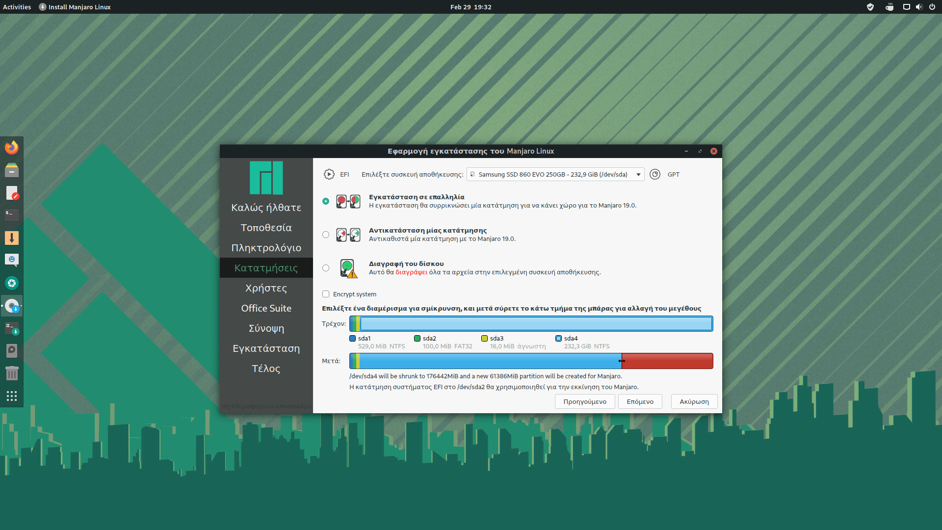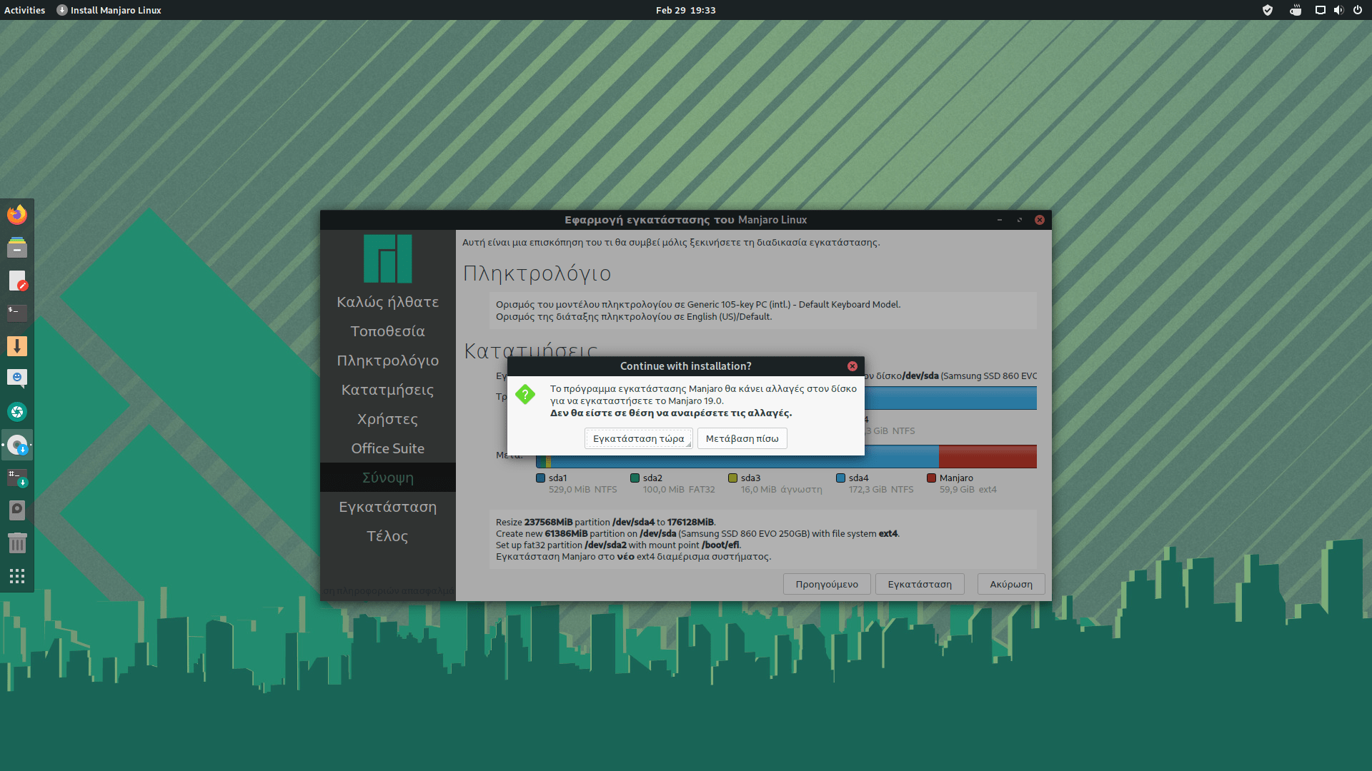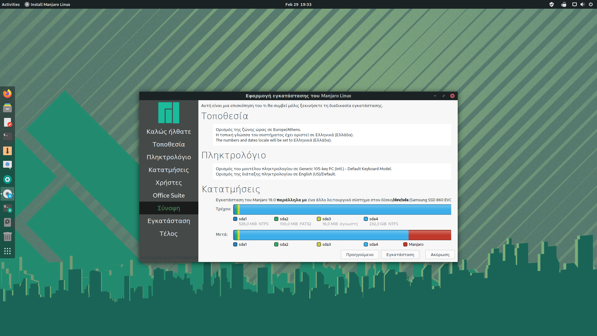 8. Σιγουρέψου πως όλα είναι σωστά και έχεις δώσει τον απαραίτητο χώρο στο Manjaro για να λειτουργεί σωστά, κάνε κλικ στο “Εγκατάσταση“.