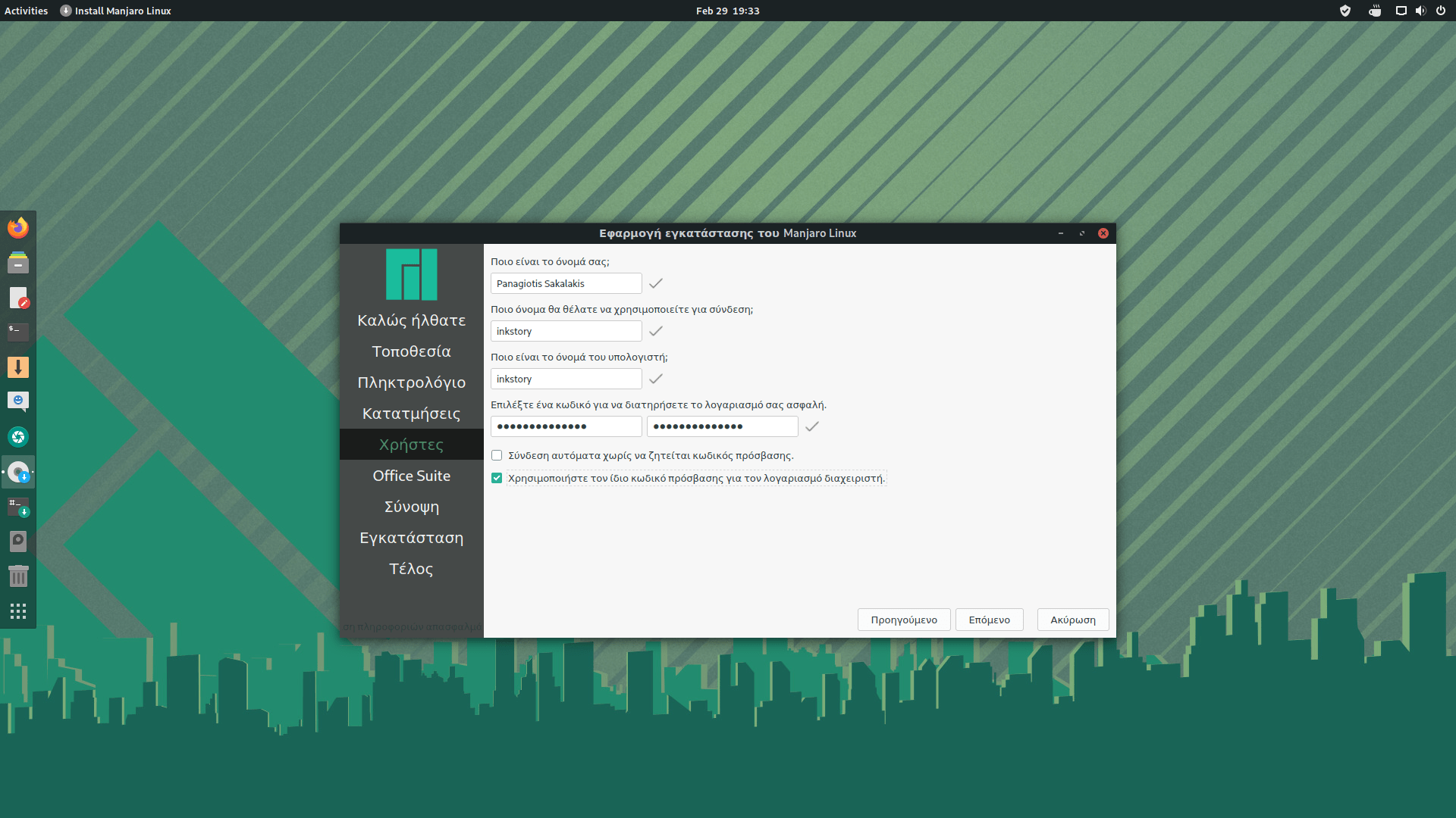 6. Συμπλήρωσε τα απαραίτητα πεδία βάζοντας και έναν κωδικό πρόσβασης με τον οποίο θα συνδέεσαι κάθε φορά στο λειτουργικό και θα εκτελείς εντολές. Μόλις τα συμπληρώσεις κάνε κλικ στο “Επόμενο“.