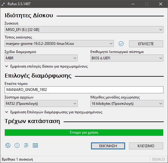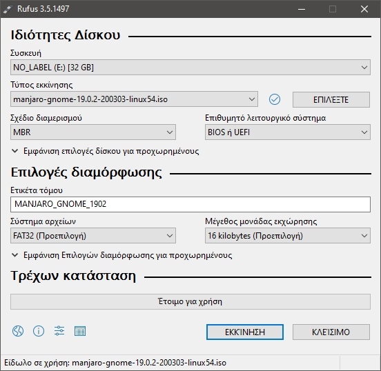Μόλις κατέβουν και δύο, σύνδεσε το USB φλασάκι σου στον υπολογιστή ή το laptop και άνοιξε το Rufus. Με το που το ανοίξεις, κάνε κλικ στο κουμπί “Επιλέξτε” και πάνε στο φάκελο που κατέβασες το Manjaro Linux και επέλεξε το. Σιγουρέψου επίσης πως έχεις επιλέξει να εγκατασταθεί στο σωστό USB φλασάκι.