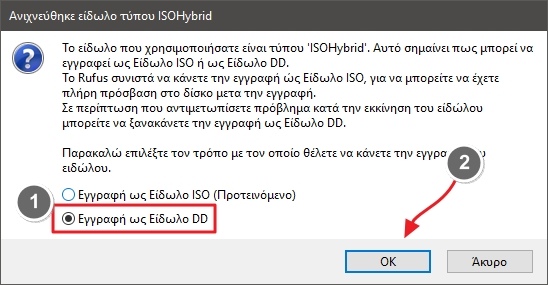 Επέλεξε την δεύτερη επιλογή “Εγγραφή ως Είδωλο DD” καθώς με την πρώτη δεν θα λειτουργήσει το Live USB. Στο επόμενο παραθυράκι που θα εμφανιστεί, πάτα απλά στο “ΝΑΙ” και περίμενε έως ότου ολοκληρωθεί η διαδικασία.