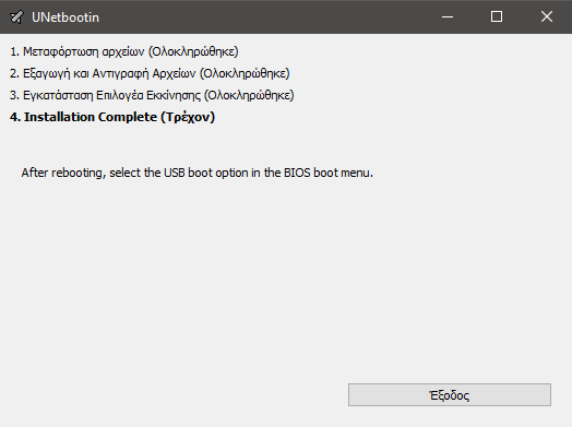 3. Με το που ολοκληρωθεί η διαδικασία, απλά πάτα έξοδος για να κλείσει το Unetbootin. Εφόσον σου λέει πως έχουν ολοκληρωθεί όλα, τότε το USB φλασάκι σου έγινε bootable και μπορείς να προχωρήσεις στην επόμενη ενότητα.