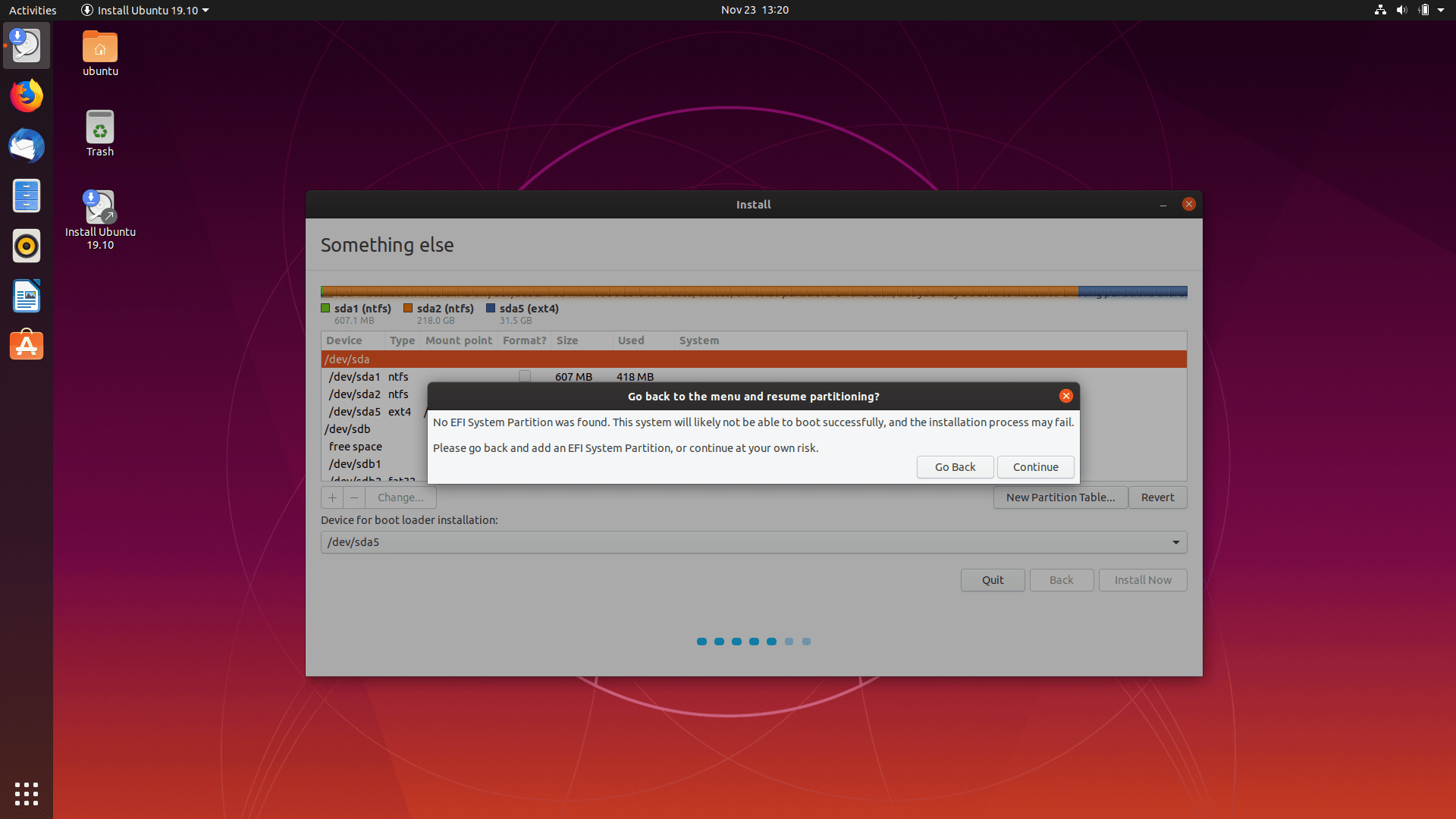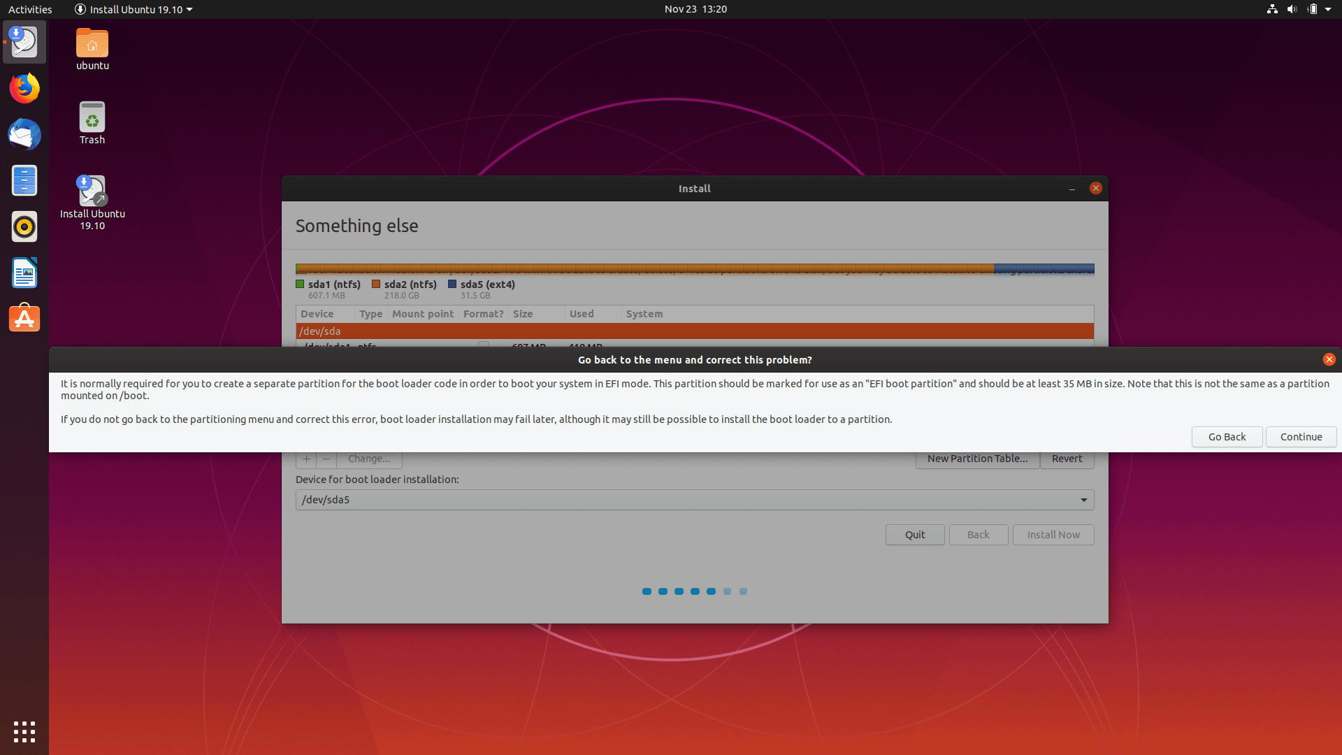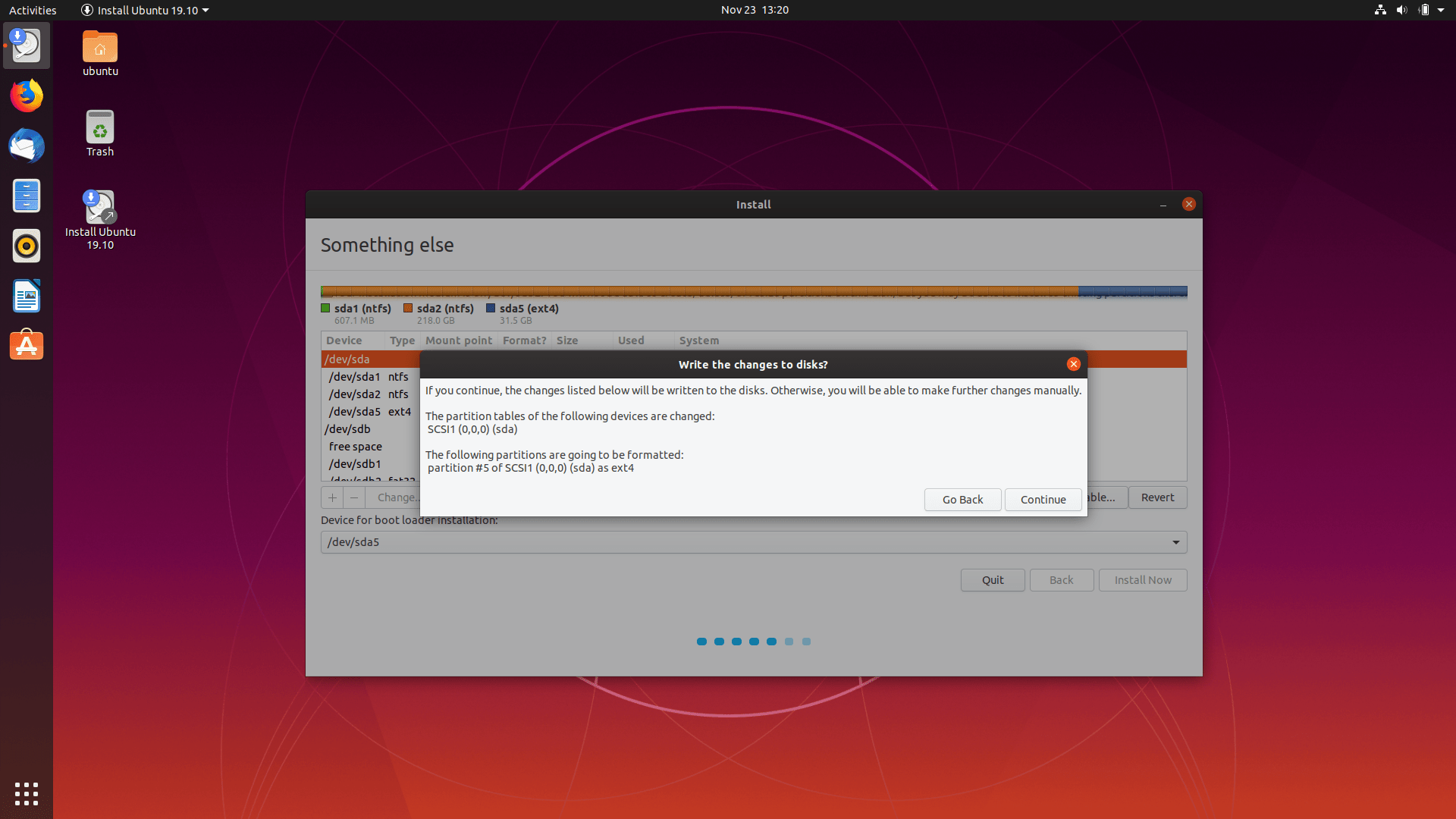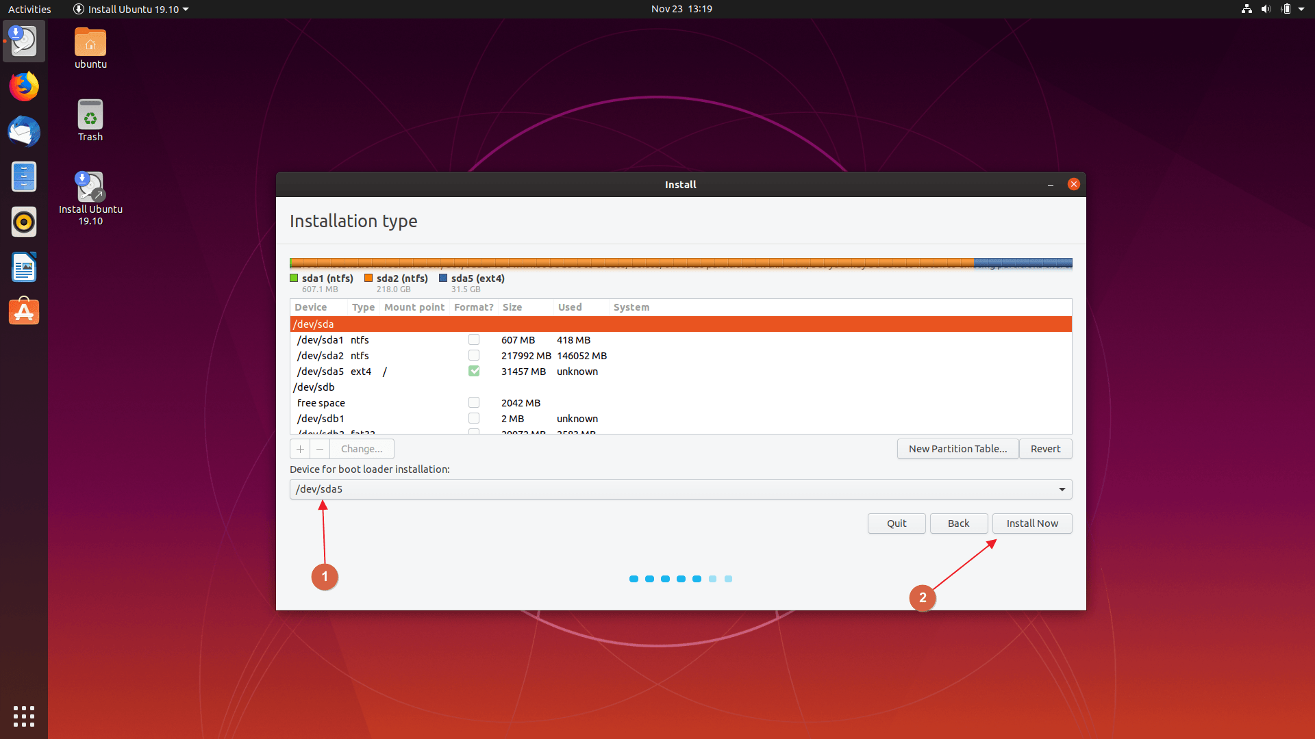 8. Στη συνέχεια, επέλεξε σε ποιο μέρος θέλεις να περαστεί το boot loader. Επέλεξε το “sda5” και κάνε κλικ στο “Install Now” για να ξεκινήσει η εγκατάσταση του Ubuntu.