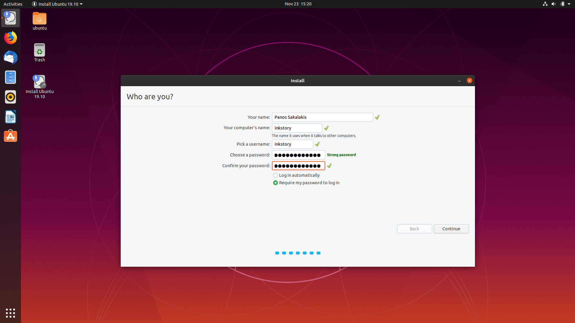 13. Στη συνέχεια, συμπλήρωσε το όνομα σου, το όνομα που θέλεις να έχει το Ubuntu, ένα username και έναν κωδικό πρόσβασης για να συνδέεσαι. Μπορείς επίσης να επιλέξεις στο τέλος την επιλογή “Login automatically” έτσι ώστε να σε συνδέει αυτόματα κάθε φορά που επιλέγεις να μπεις με το Ubuntu.