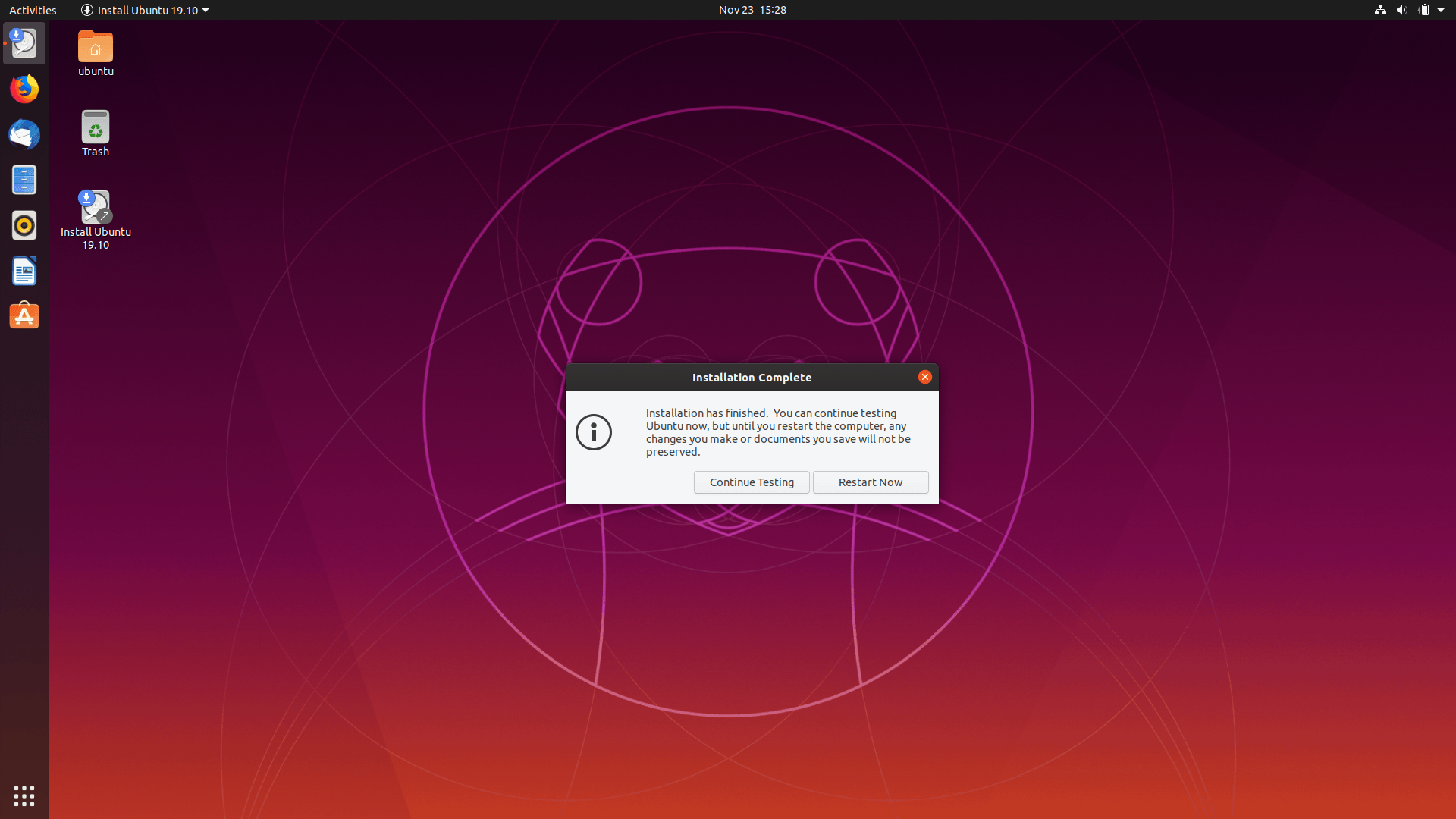 15. Μόλις η εγκατάσταση του Ubuntu ολοκληρωθεί, μπορείς είτε να κάνεις κλικ στην επιλογή “Continue Testing” για να συνεχίσεις να χρησιμοποιείς το Ubuntu μέσω του USB, ή να πατήσεις στο “Restart Now” για να κάνει επανεκκίνηση ο υπολογιστής και να μπεις με το Ubuntu ή τα Windows.