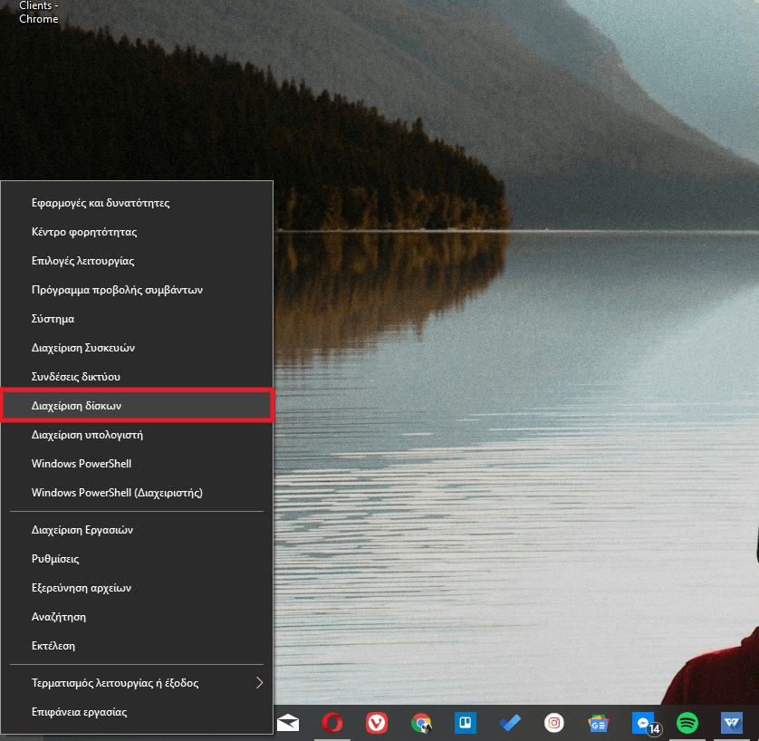 1. Για να δημιουργήσεις ένα καινούργιο partition για το Linux, πάνε στο μενού της έναρξης των Windows και κάνε δεξί κλικ και επέλεξε την επιλογή “Διαχείριση δίσκων.”