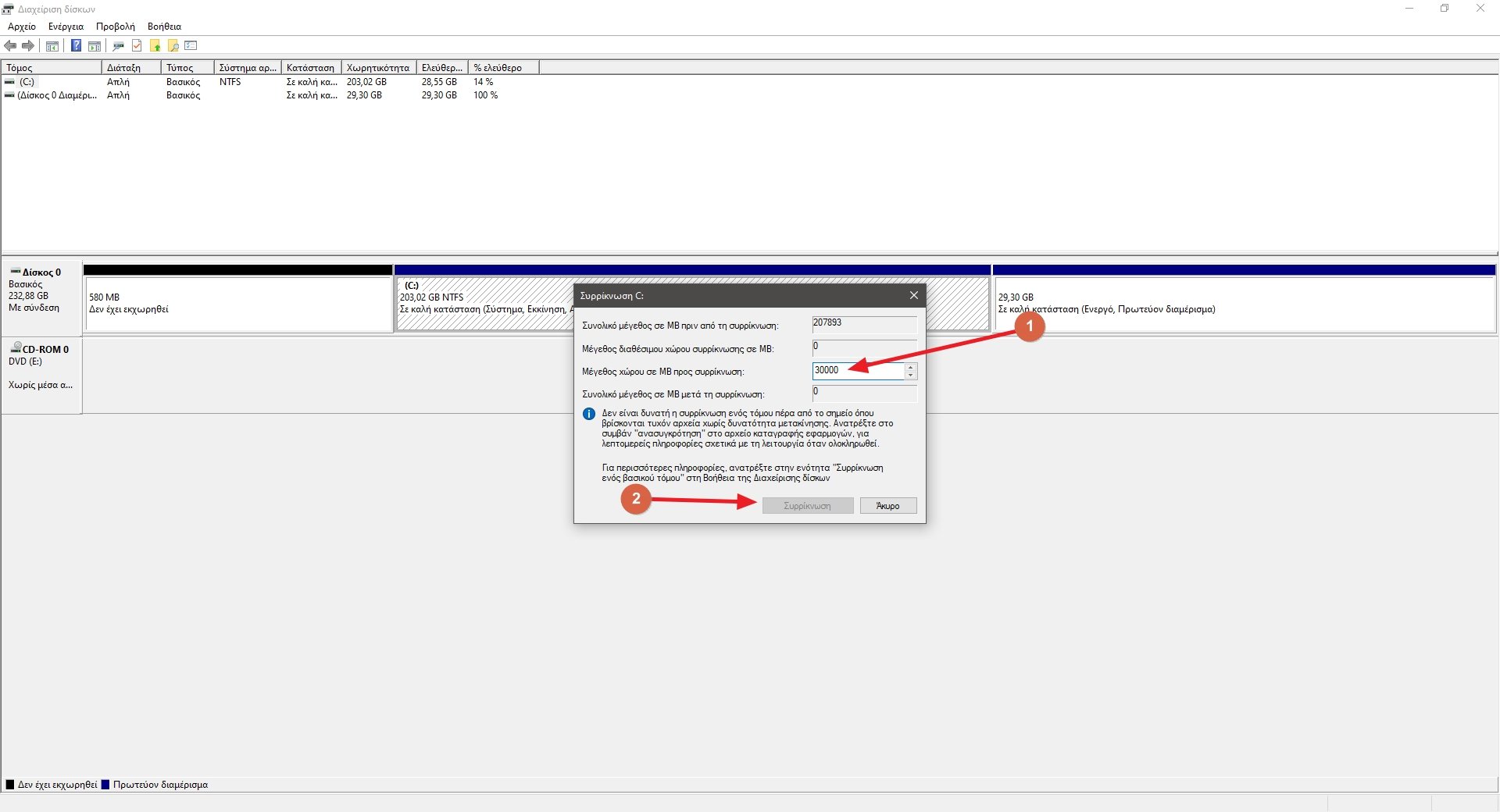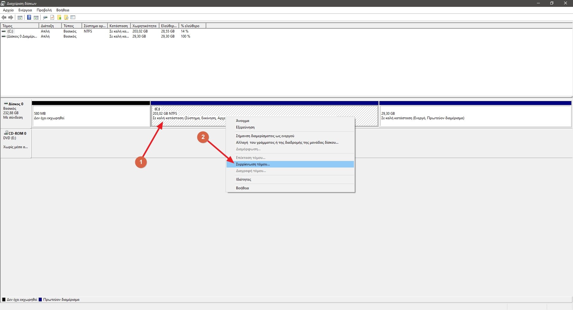 2. Στη συνέχεια, μόλις ανοίξει το παράθυρο με την διαχείριση δίσκων, κάνε δεξί κλικ πάνω στον δίσκο που θέλεις και επέλεξε την επιλογή “Συρρίκνωση τόμου.”
