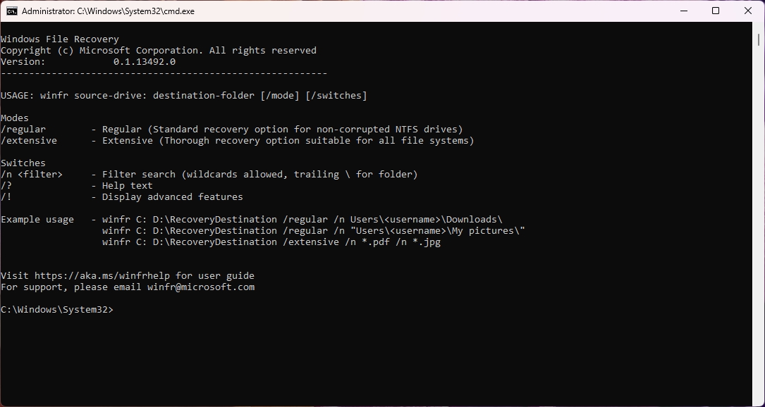 Παρόλα αυτά το Windows File Recovery δεν παρέχει κάποιο γραφικό περιβάλλον, που σημαίνει πως έχουμε να κάνουμε με το Command Prompt του, στο οποίο θα χρειαστεί να δώσουμε μερικές εντολές για να επαναφέρουμε τα αρχεία μας.