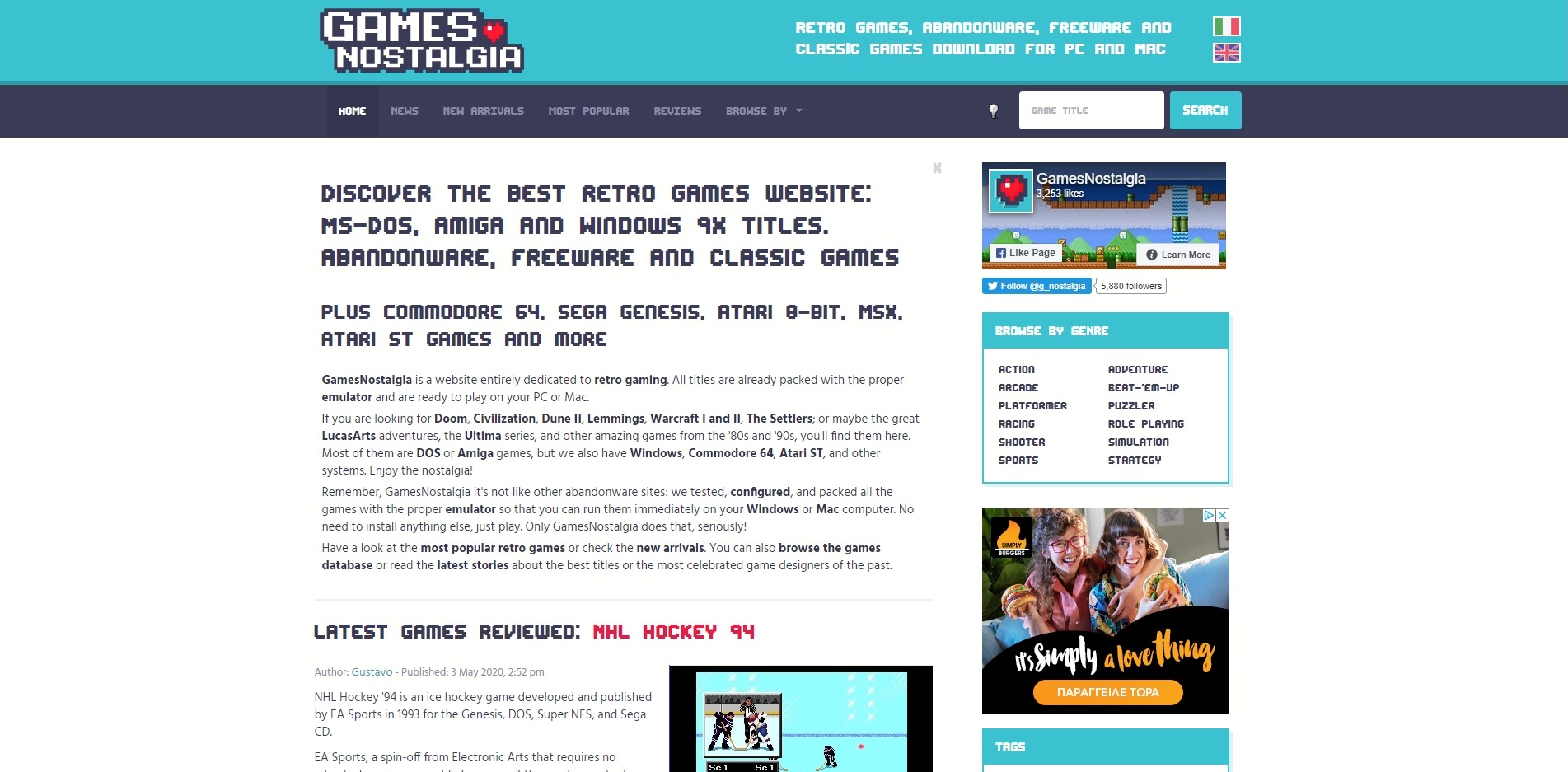 Αν θέλεις να κάνεις ένα γρήγορο ταξιδάκι στο παρελθόν, τότε το Games Nostalgia είναι αναμφισβήτητα από τις καλύτερες ιστοσελίδες με δωρεάν παλιά games. Το Games Nostalgia περιλαμβάνει ορισμένους καταπληκτικούς τίτλους που έκαναν πάταγο μεταξύ του 1985 και 1995. Η ιστοσελίδα είναι ιδιαίτερα εύκολη στην χρήση και σου επιτρέπει να αναζητάς games βάση του είδους τους, μέσω ετικετών, βάση κυκλοφορίας, δημοτικότητας, μεταξύ άλλων.