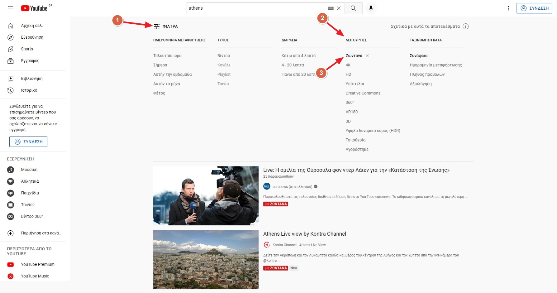 Για να βλέπεις μόνο τα live βίντεο, κάνε μια αναζήτηση στο YouTube όπως Αθήνα ή Live in Athens και από τα φίλτρα των αποτελεσμάτων, επέλεξε κάτω από την ενότητα “Λειτουργίες” να εμφανίζονται μόνο τα “Ζωντανά“. Με αυτό τον τρόπο δεν θα βρίσκεις εκατομμύρια βίντεο, αλλά μόνο οτιδήποτε υπάρχει live. (Μπορείς να βρεις τις οδηγίες από την παρακάτω εικόνα).