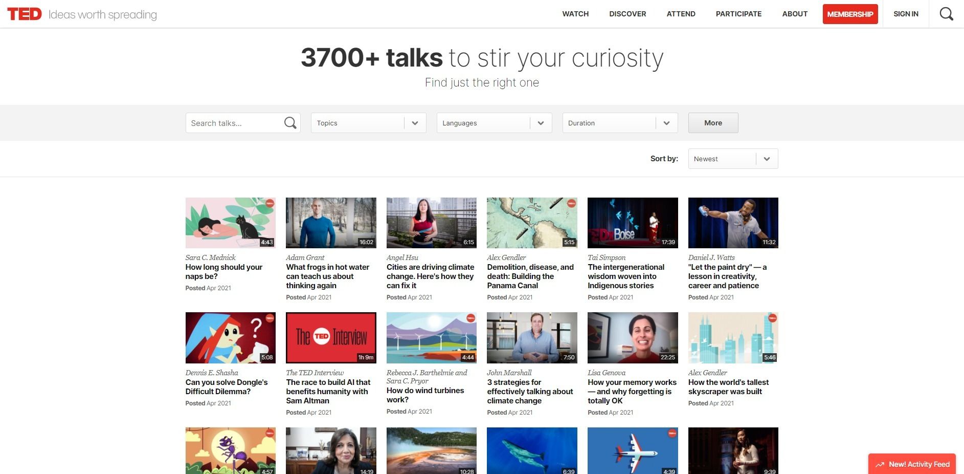Το TED Talks δεν είναι απλά πασίγνωστο, αλλά και μια από τις καλύτερες ιστοσελίδες σαν το YouTube. Περιλαμβάνει χιλιάδες ομιλίες που εστιάζουν σε πολλές και διαφορετικές θεματολογίες, όπως την τεχνολογία, την επιχειρηματικότητα, τον σχεδιασμό, την επιστήμη και θέματα που αφορούν ολόκληρο τον πλανήτη.