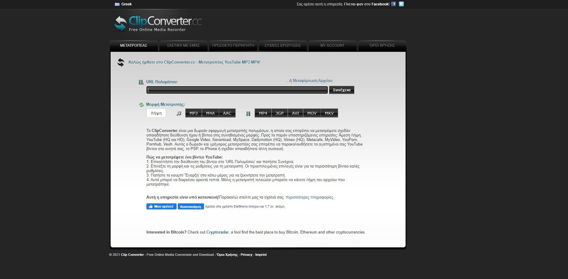 Το ClipConverter είναι μια από τις παλαιότερες ιστοσελίδες του είδους και σου επιτρέπει να κατεβάζεις τραγούδια σε MP3, M4A και AAC μορφή, αλλά και βίντεο σε MP4, 3GP, AVI, MOV και MKV μορφές.