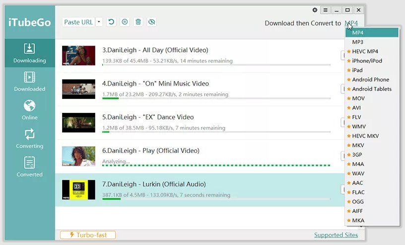 Το iTubeGo πάει το κατέβασμα τραγουδιών και βίντεο από το YouTube στο επόμενο επίπεδο, παρέχοντας διαθέσιμες εφαρμογές τόσο για τις Android συσκευές, όσο και για τους κατόχους iPhone συσκευών. Μπορεί να αποθηκεύσει σε μορφές MP3, MP4, M4A και σε ορισμένες ακόμα, ενώ υποστηρίζει πάνω από 1,000 ιστοσελίδες, μεταξύ τους και το YouTube, Netflix, Facebook, Instagram και Dailymotion, Vimeo και BBC.