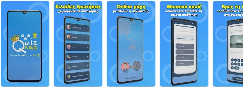 Το Quiz King είναι αναμφισβήτητα ένα από τα καλύτερα κουίζ γενικών γνώσεων, παρέχοντας πολλαπλές διαφορετικές κατηγορίες που μπορείς να επιλέξεις, ενώ επιτρέπει στους χρήστες του να παίρνουν μέρος σε διαγωνισμούς ώστε να γίνουν οι επόμενη βασιλιάδες των κουίζ. Το παιχνίδι έρχεται επίσης με τέσσερα διαφορετικά modes, όπως το κλασικό QuizKing, την 1 vs. 1 μάχη, τους διαγωνισμούς που μπορείς να λάβεις μέρος και την ατομική πρόκληση, η οποία βάζει τον εαυτό σου στην απόλυτη διαμάχη.