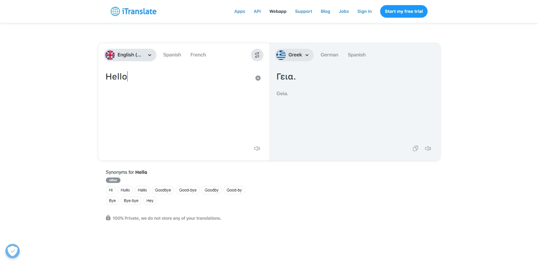 Το iTranslate είναι ένα δωρεάν σύστημα μετάφρασης το οποίο αναπτύχθηκε από την εταιρεία Sonico Mobile. Η υπηρεσία κάνει εξαιρετική δουλειά στη μετάφραση λέξεων, κειμένων και ιστοσελίδων και υποστηρίζει αυτή την στιγμή περισσότερες από 100 γλώσσες. Αν και δεν είναι ιδιαίτερα γνωστό, παρέχει ένα μοντέρνο και προσεγμένο περιβάλλον το οποίο λειτουργεί ακριβώς όπως και η μετάφραση της Google και της Microsoft.