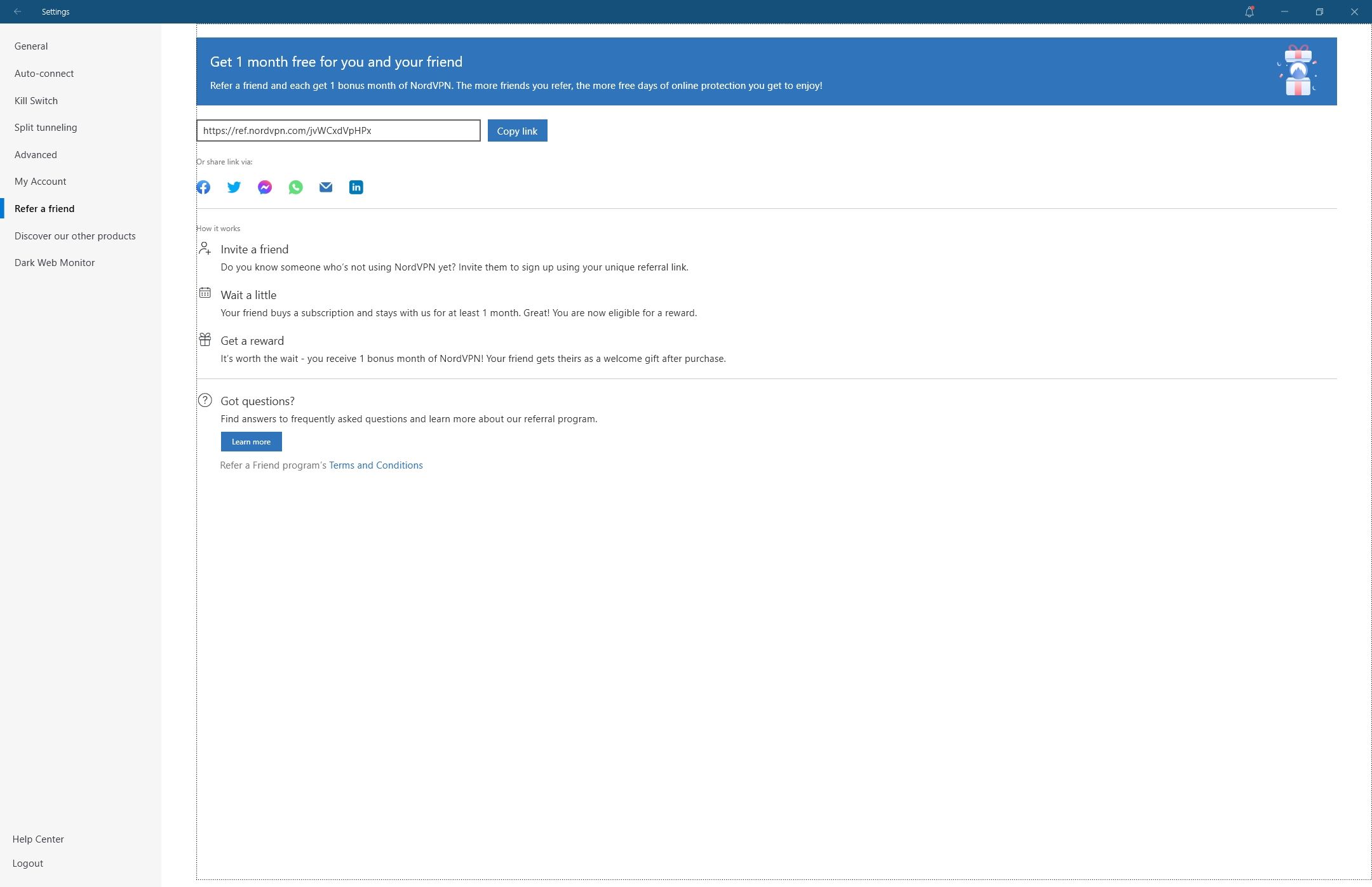 Η σελίδα “Refer a friend” μέσα στις Ρυθμίσεις του NordVPN.