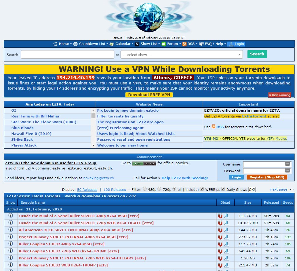 Το EZTV ευθύνεται για την γρήγορη κυκλοφορία επεισοδίων από όποια σειρά μπορείς να φανταστείς. Είναι υπεύθυνο για τις περισσότερες σειρές που βγαίνουν και ενώ παρέχει και την δική του ιστοσελίδα, τα torrents με τις σειρές που ανεβάζει μπορείς να τα βρεις και σε άλλες ιστοσελίδες όπως στο 1337x.