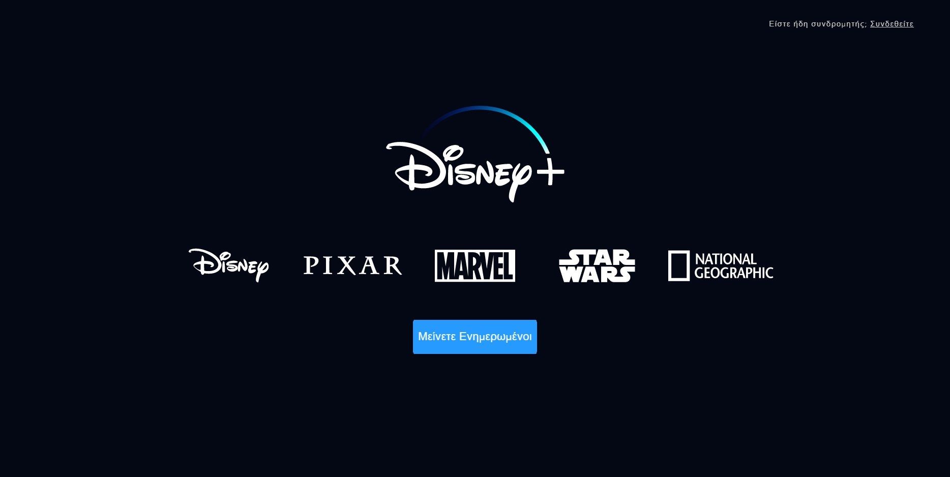 Αν και το Disney+ δεν είναι ακόμα διαθέσιμο στην Ελλάδα, η εταιρεία αναφέρει πως αρκετές χώρες της Ευρωπαϊκής Ένωσης θα έχουν πρόσβαση στην υπηρεσία της μέσα στο 2021. Φυσικά, μπορείς να εγγραφείς στο newsletter της υπηρεσίας ώστε να ειδοποιηθείς με το που γίνει διαθέσιμη στην χώρα μας, καθώς θα έρθει με μια τεράστια γκάμα από αγαπημένες παλιές και καινούργιες ταινίες και σειρές.