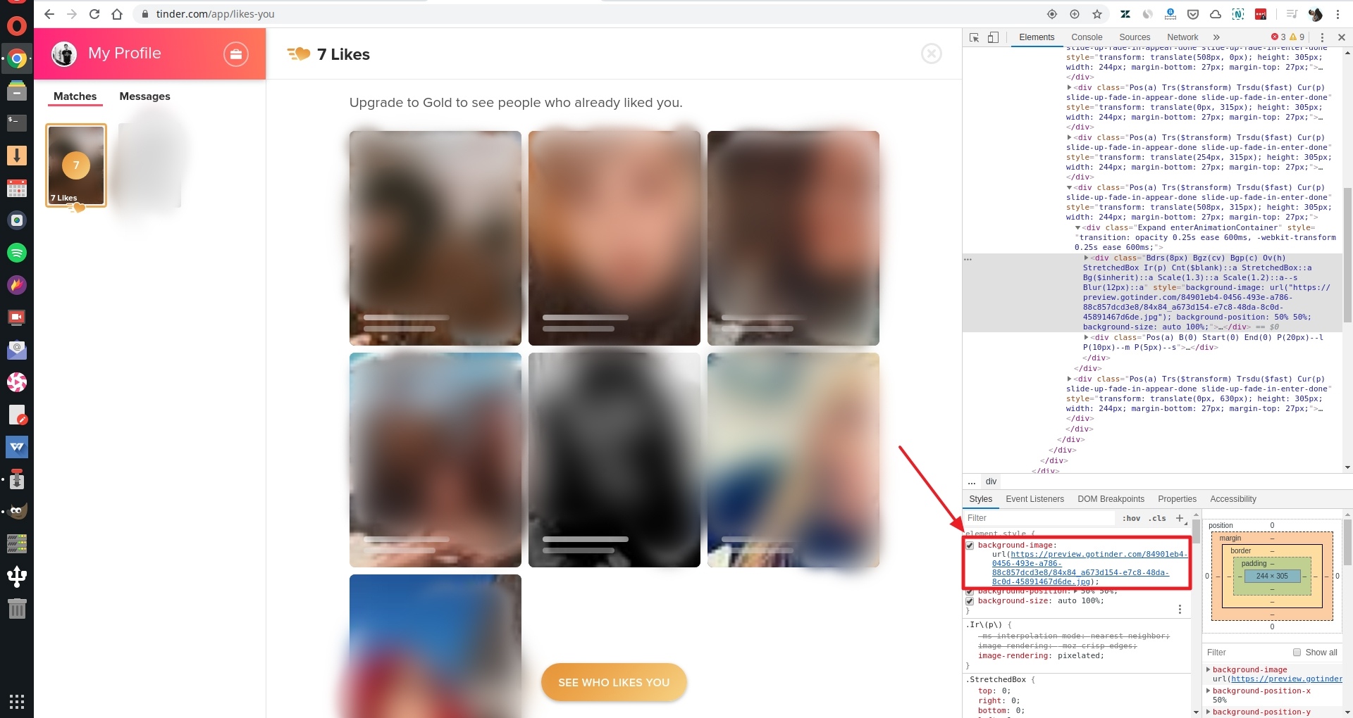 4. Τέρμα κάτω, στο παραθυράκι "Style" κατέβα προς τα κάτω έως ότου βρεις το filter: blur(12px); και από 12px κάντο σε 1px για να εμφανιστούν λιγότερο θολωμένες όλες οι εικόνες στην σελίδα με τους χρήστες που σε έκαναν like στο Tinder.