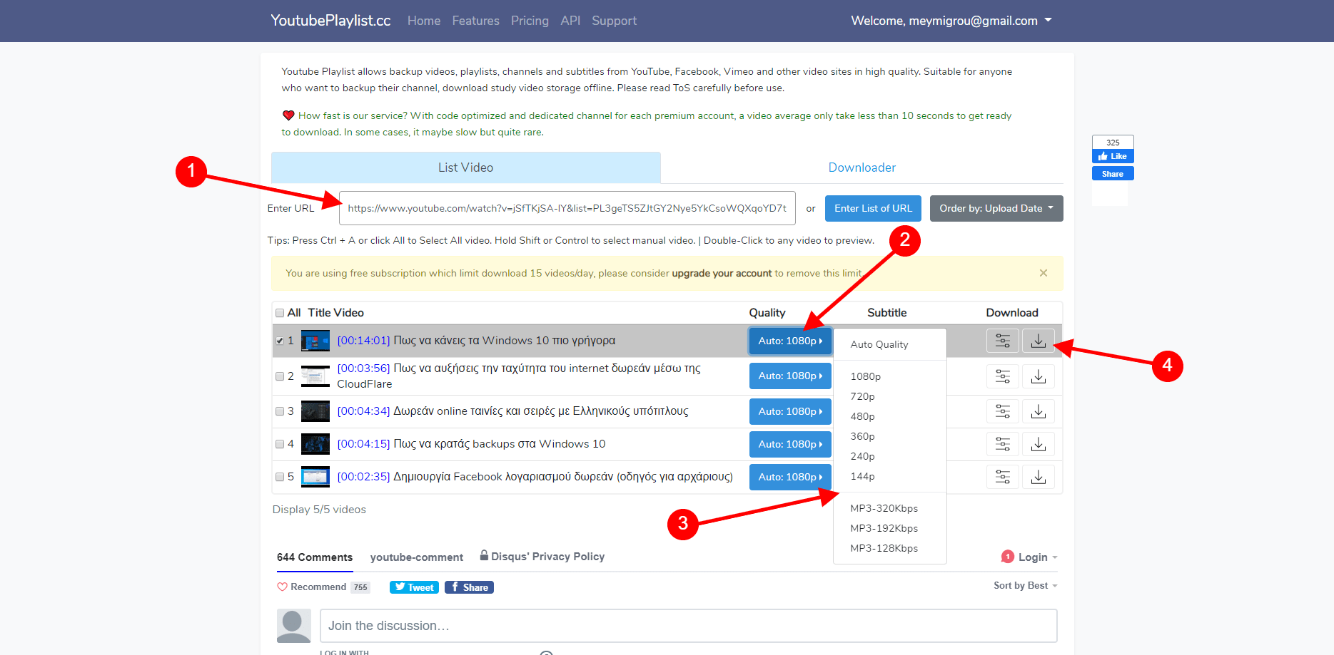 Για να κατεβάσεις μια YouTube playlist από την ιστοσελίδα, αλλά επιλέγοντας ένα ένα τα κομμάτια, απλά επικόλλησε το σύνδεσμο της στο διαθέσιμο πεδίο, επέλεξε την ποιότητα κάθε βίντεο ή το αρχείο που θέλεις να κατεβάσεις και πάτα στο download κουμπί.