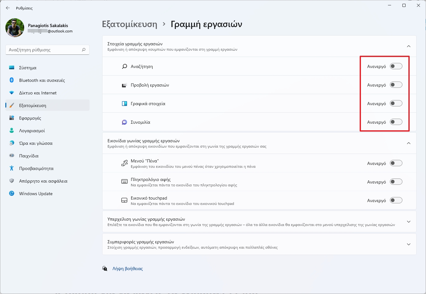 Από εκεί, απενεργοποίησε οτιδήποτε δεν χρειάζεσαι. Αν θες, απενεργοποίησε τα όλα για ακόμη υψηλότερη ταχύτητα. Για το πεδίο της αναζήτησης, αν ανοίξεις το μενού της Έναρξης και ξεκινήσεις να πληκτρολογείς, θα εμφανιστεί αυτόματα το παράθυρο της αναζήτησης, οπότε δεν υπάρχει λόγος να υπάρχει στη γραμμή εργασιών.