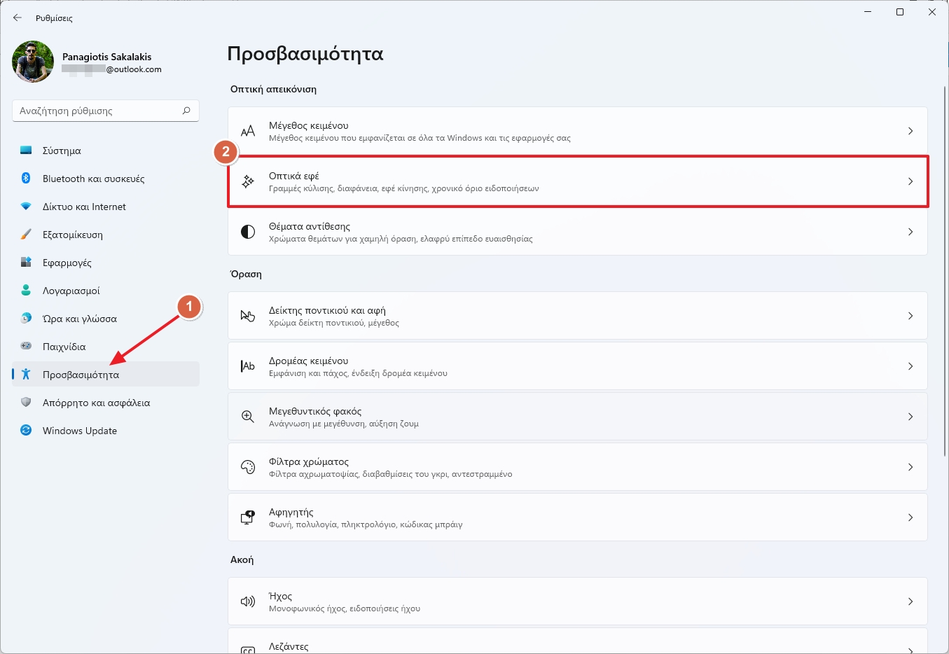 Άνοιξε τις Ρυθμίσεις και πήγαινε στην καρτέλα “Προσβασιμότητα” και κάνε κλικ στην επιλογή “Οπτικά εφέ“.