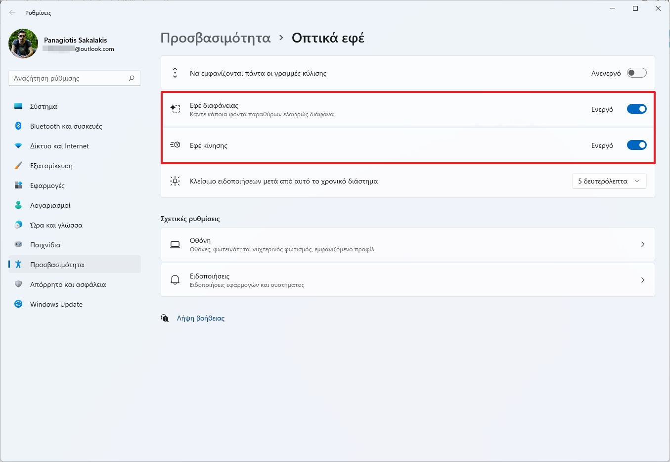 Από εδώ, απενεργοποίησε τις επιλογές “Εφέ διαφάνειας” και “Εφέ κίνησης“.