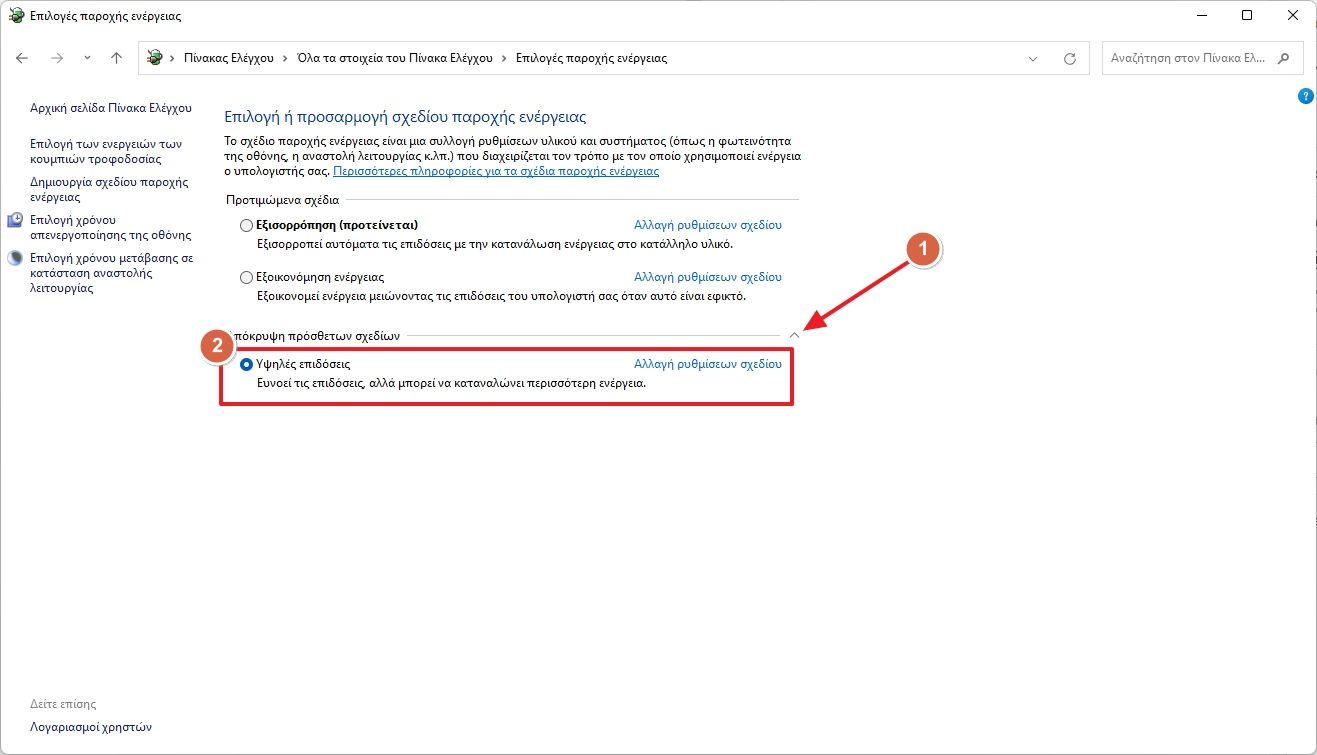 Επέλεξε την λειτουργία “Υψηλές επιδόσεις” και κλείσε το παράθυρο. Αν δεν υπάρχει αυτή η δυνατότητα, μπορεί να είναι “κρυμμένη” κάτω από την επιλογή “Προβολή πρόσθετων σχεδίων“.