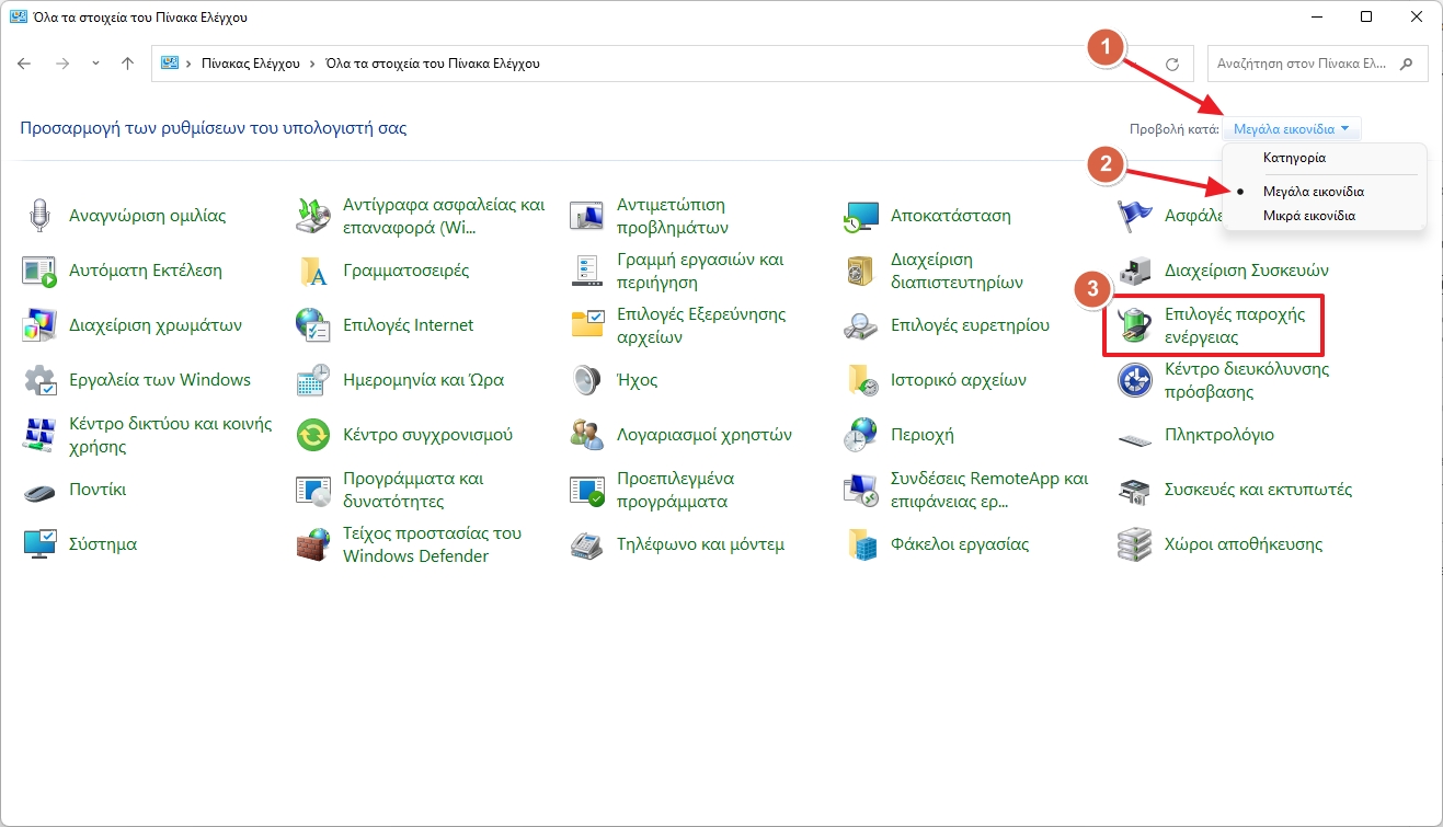 Στη συνέχεια, κάνε κλικ στην επιλογή “Προβολή κατά” και αμέσως μετά επέλεξε την επιλογή “Μεγάλα εικονίδια“, και τέλος κάνε κλικ στην επιλογή “Επιλογές παροχής ενέργειας“.