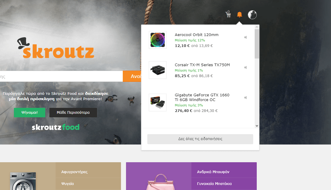 - Ειδοποιήσεις: Αν έχεις βάλει στα αγαπημένα σου έστω και ένα προϊόν, το Skroutz θα σε ειδοποιεί κάθε φορά που η τιμή του προϊόντος πέφτει ή έχει υπάρξει μια νέα αξιολόγηση σε αυτό.