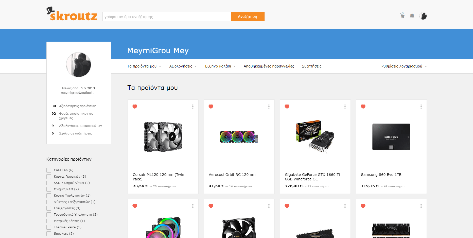 - Τα προϊόντα που έχω: Από αυτή την σελίδα θα έχεις την δυνατότητα να δεις όλα τα προϊόντα τα οποία έχεις αγοράσει μέσω του Skroutz.