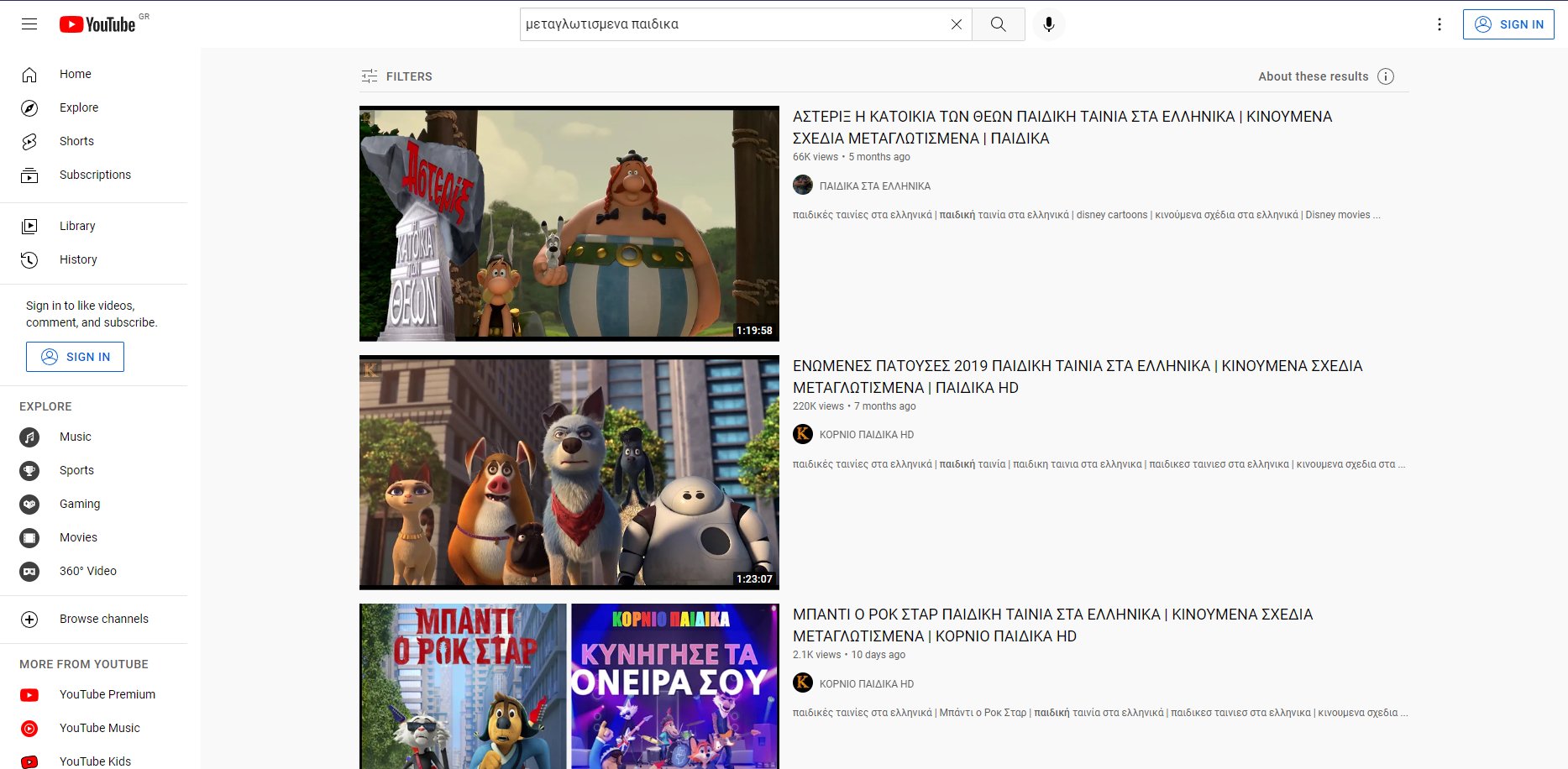Το YouTube μπορεί να μην είναι μια streaming υπηρεσία, αλλά αυτό δεν παύει να σημαίνει πως η πλατφόρμα δεν φιλοξενεί μια πληθώρα επιλογών από ολόκληρες ταινίες και σειρές. Με μια γρήγορη αναζήτηση “μεταγλωττισμένα παιδικά“, θα εντοπίσεις γρήγορα αρκετά από τα πιο γνωστά παιδικά, τα οποία είναι μεταγλωττισμένα στα ελληνικά και παρέχονται εντελώς δωρεάν προς όλους.