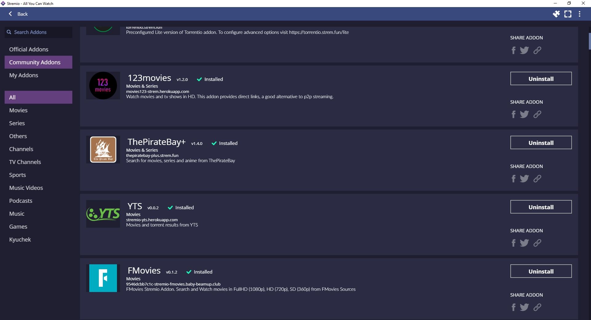 Τέλος, οι πιο ειδικευμένοι χρήστες μπορούν να ανακαλύψουν και να εγκαταστήσουν ακόμα περισσότερα πρόσθετα, πολλά από τα οποία μπορούν να βρουν διαθέσιμα στο PimpMyStremio, στις κοινότητες του Reddit, στο Stremio Downloader κ.α.