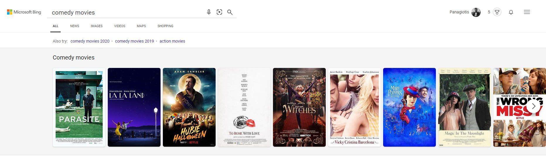 Τις ίδιες αναζητήσεις μπορείς να κάνεις και στην Bing (βλέπε: “Comedy movies“), στην οποία ωστόσο υπάρχει ένα κολπάκι: Με το που επισκεφτείς το bing.com, απλά πάνε πάνω δεξιά στο γρανάζι με τις ρυθμίσεις, επέλεξε να αλλάξεις την χώρα / τοποθεσία και δήλωσε τις ΗΠΑ. Στη συνέχεια, αναζήτησε παρόμοιες λέξεις με τις παραπάνω και θα δεις εντελώς διαφορετικά και πιο μοντέρνα και σύγχρονα αποτελέσματα.
