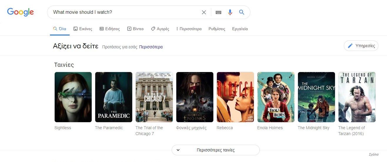 Ο πρώτος και πιο εύκολος τρόπος για να βρεις προτεινόμενες ταινίες είναι να επισκεφτείς την Google ή την Bing, να γράψεις “What movie should I watch?” και να πατήσεις Enter. Έτσι, και οι δύο μηχανές αναζήτησης θα σου εμφανίσουν αποτελέσματα με ταινίες που θεωρούν πως αξίζει να παρακολουθήσεις.