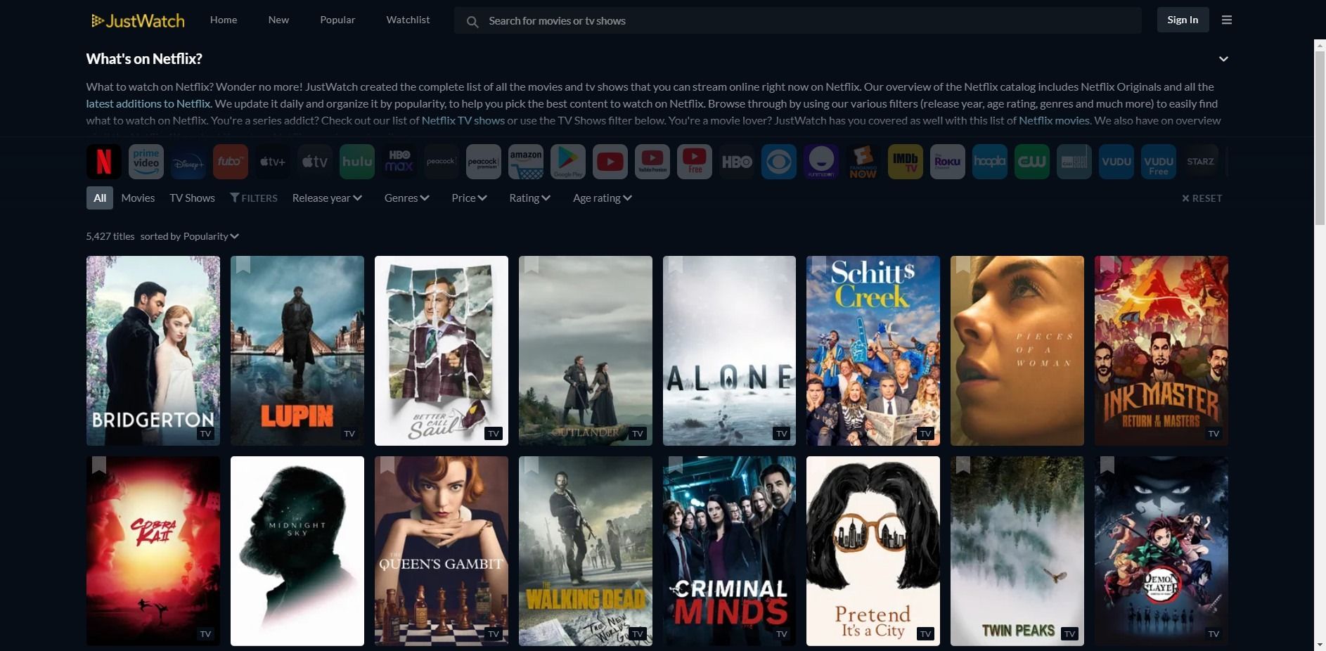 Μπορεί να είναι το πέμπτο στη λίστα, αλλά το JustWatch δίνει την απάντηση στην ερώτηση “Τι ταινία να δω στο Netflix;“. Το JustWatch, το οποίο είναι επίσης διαθέσιμο για iOS και Android συσκευές, σου επιτρέπει να αναζητείς για σειρές και ταινίες βάση υπηρεσιών (Netflix. IMDb, Hulu, Disney+, Amazon Prime, HBO Max, Apple TV, YouTube, The CW, μεταξύ άλλων) και βάση δημοτικότητας, ενώ σου δίνει επίσης την δυνατότητα δημιουργείς λίστες ώστε να κρατάς σημειωμένα τα επεισόδια σειρών ή τις ταινίες που που θέλεις να παρακολουθήσεις ή έχεις παρακολουθήσει ήδη.