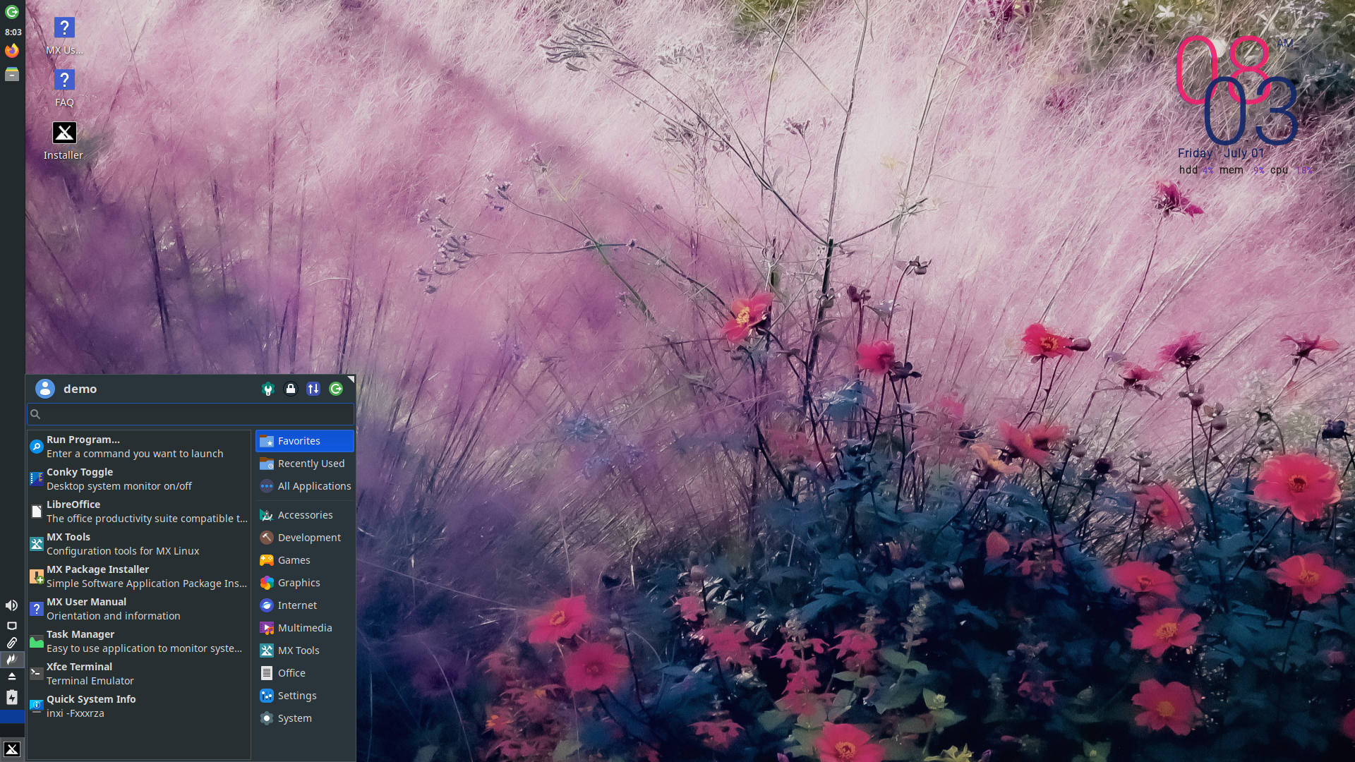 Η διανομή έρχεται επίσης με τα παραδοσιακά εικονίδια στην επιφάνεια εργασίας – κάτι που αρκετοί συνεχίζουν να προτιμούν μέχρι και σήμερα – ενώ θα βρεις και το διαθέσιμο μενού του MX Linux τέρμα κάτω αριστερά.