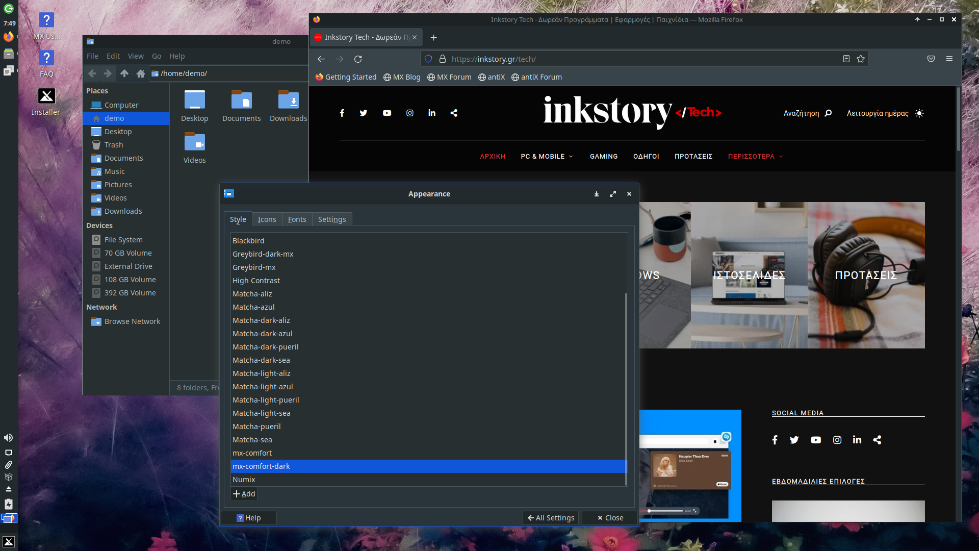 Αρχικά, ένα από τα πρώτα πράγματα που θα παρατηρήσεις είναι πως το MX Linux διατηρεί ένα πιο “παραδοσιακό” περιβάλλον σε όσο αφορά τον σχεδιασμό και την αισθητική. Η διανομή έρχεται επίσης και με dark mode: