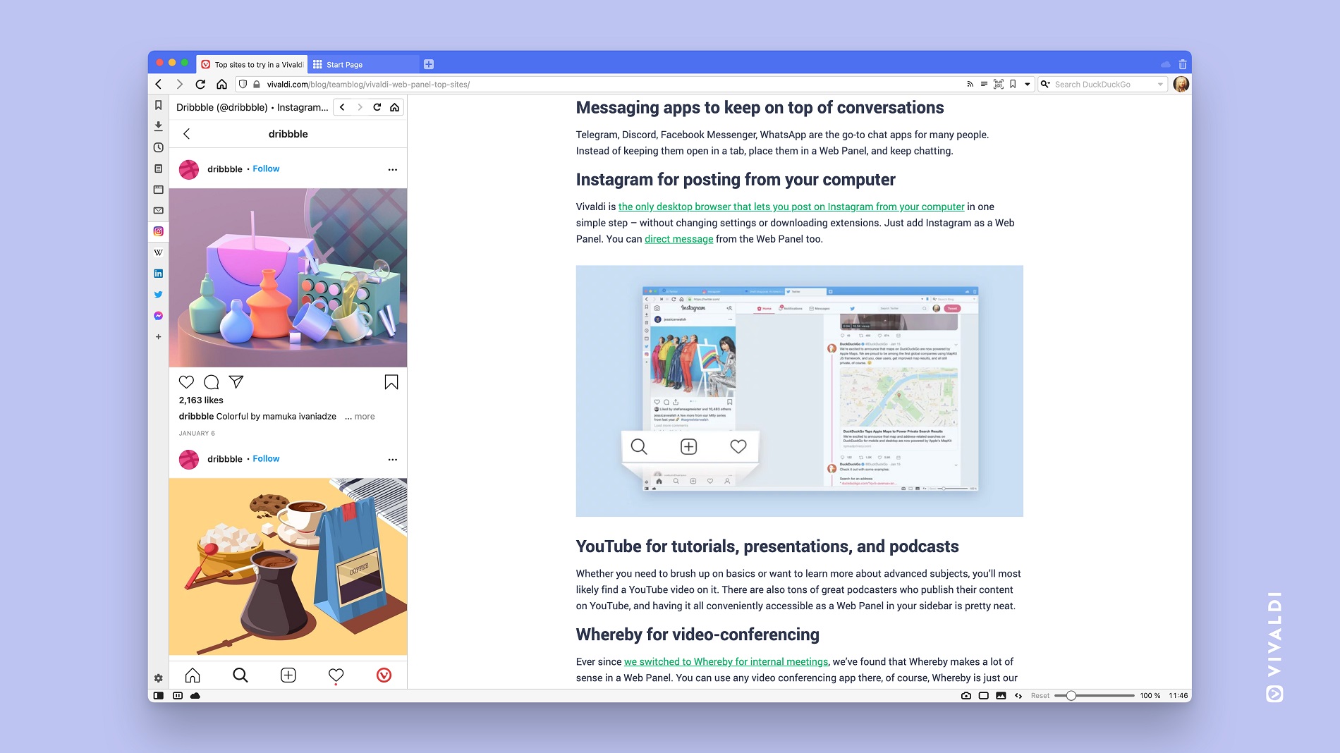Το Web Panel του Vivaldi θυμίζει αρκετά αυτό που είχε κάποτε ο Opera, αλλά πιο ευέλικτο και προσαρμόσιμο στις ανάγκες του κάθε χρήστη. Το Web Panel βρίσκεται στην αριστερή μεριά του browser όταν τον εγκαταστήσεις για πρώτη φορά και σου επιτρέπει να προσθέτεις όλες τις αγαπημένες σου ιστοσελίδες, τις οποίες θα μπορείς να ανοίγεις την οποιαδήποτε στιγμή.